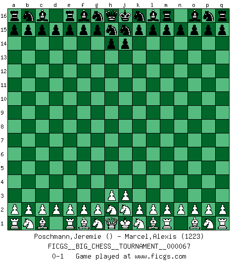 Last move : 0-1 2010 July 21 21:40:6 [Event "FICGS__BIG_CHESS__TOURNAMENT__000067"] [Site "FICGS"] [Date "2010.06.21"] [Round "1"] [White "Poschmann,Jeremie"] [Black "Marcel,Alexis"] [Result "0-1"] [WhiteElo ""] [BlackElo "1223"] 0-1 This big chess game has been lost on time (started : 2010.06.21 13:33:33) Follow this game move after move (download)When you see a good move, look for a better one. (Emanuel Lasker) Wenn Capablanka heute auf der Schachbühne erscheinen würde, hätte er ein halbes Jahr gebraucht um sich die Schachtheorie anzueignen. Und dann hätte er alles und jeden besiegt. (Mikhail Moiseyevich Botvinik) El jugador táctico debe saber que hacer cuando algo se debe de hacer. El estratégico debe saber que hacer cuando nada se debe de hacer. (Savielly Tartakover) Une platitude souvent récitée à propos des Echecs est qu'une des choses les plus difficiles à réaliser est de gagner une position gagnante. Cela ne manque pas de sens mais, pour ma part, j'ai toujours trouvé plus difficile de gagner une position perdante. (Tim Krabbe) Luck never made a man wise. (Seneca, Letters to Lucilius)