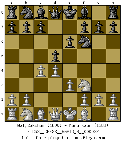 Last move : 1-0 2007 January 6 22:26:24 [Event "FICGS__CHESS__RAPID_B__000022"] [Site "FICGS"] [Date "2006.11.05"] [Round "1"] [White "Wal,Saksham"] [Black "Kara,Kaan"] [Result "1-0"] [WhiteElo "1600"] [BlackElo "1588"] 1.d4 d5 2.c4 e6 3.Nf3 Nf6 4.e3 1-0 This chess game has been lost on time (started : 2006.11.05 19:5:58) Queen's gambit declined Player White won this chess game. Follow this game move after move (download)You are for me the Queen on d8 and I am the Pawn on d7 !! (Eduard Gufeld) Ein Großmeister muß tausende Partien in seinem Kopf speichern, denn diese sind für Ihn, was die Worte der Muttersprache für gewöhnliche Leute sind, oder Noten für Musiker... (Garry Kasparov) La vida es como el Ajedrez, con lucha, competición y eventos buenos y malos. (Benjamin Franklin) Karpov est une pièce de musée. (Garry Kasparov) Logic : The art of thinking and reasoning in strict accordance with the limitations and incapacities of the human misunderstanding. (Ambrose Bierce)