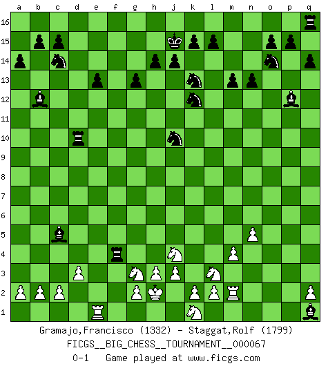 Last move : 0-1 2010 August 13 20:47:19 [Event "FICGS__BIG_CHESS__TOURNAMENT__000067"] [Site "FICGS"] [Date "2010.06.21"] [Round "1"] [White "Gramajo,Francisco"] [Black "Staggat,Rolf"] [Result "0-1"] [WhiteElo "1332"] [BlackElo "1799"] 1.m2-m4 j15-k13 2.l1-o4 e15-e13 3.n2-n3 d15-d13 4.o1-f9 g16-j15 5.e2-e4 h15-g13 6.f1-c4 m15-m13 7.d2-d3 c16-h11 8.f9-e10 b16-c14 9.c1-n11 n15-n13 10.o4-g11 f16-b12 11.p1-n2 p16-o14 12.b1-c3 o16-f8 13.j2-l3 l16-p12 14.l3-j4 k16-l14 15.n11-p13 q15-q14 16.p13-k8 j15-g14 17.n2-l3 h16-o10 18.f2-f4 o10-e10 19.j4-k6 e10-o10 20.h1-l4 o10-k6 21.h2-j4 k6-p6 22.l4-b13 a16-b16 23.c4-h9 a15-a14 24.b13-a12 g13-e12 25.e1-e3 e12-g11 26.h9-d13 g11-j10 27.d13-f15 e16-f16 28.f15-g14 p6-g14 29.e3-g3 g14-k11 30.k8-g5 b16-d16 31.a12-a5 k11-p6 32.n3-n4 j16-j15 33.c3-d5 p6-p2 34.g1-j2 g15-g13 35.d5-e7 p2-o2 36.e7-d9 d16-d9 37.j1-h2 l14-k12 38.a5-a6 f16-d16 39.m1-m2 o2-o9 40.a6-a10 m16-f16 41.n4-n5 d16-d10 42.a10-a8 f16-f11 43.e4-e5 h11-f13 44.a8-e4 o9-o13 45.f4-f5 d9-d4 46.e4-e3 f8-c5 47.e3-d2 o13-f5 48.g3-f3 f5-e5 49.g5-f4 d4-f4 50.f3-f4 e5-f4 51.d2-f4 f11-f4 52.j2-g3 f13-e12 53.a1-e1 e12-q1 0-1 Follow this game move after move (download)It is no time to be playing Chess when the house is on fire. (Italian Proverb) Alle Schachspieler sollten auch ein Hobby haben. (Savielly Grigorievitsch Tartakower) El Ajedrez es un cuento de Hadas de las 1001 metidas de pata. (Savielly Tartakower) Le génie consiste à savoir transgresser les règles au moment opportun. (Teichmann) There is no vagueness without wind. (Chinese proverb)