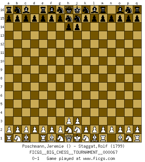 Last move : 0-1 2010 July 21 21:40:6 [Event "FICGS__BIG_CHESS__TOURNAMENT__000067"] [Site "FICGS"] [Date "2010.06.21"] [Round "1"] [White "Poschmann,Jeremie"] [Black "Staggat,Rolf"] [Result "0-1"] [WhiteElo ""] [BlackElo "1799"] 0-1 This big chess game has been lost on time (started : 2010.06.21 13:33:33) Follow this game move after move (download)I play correspondence chess because it is both art and science while chess is art only. (A player at FICGS) Ich spiele 70 Eröffnungssysteme. (Viktor Kortschnoi) El Ajedrez lo es todo: arte, ciencia y deporte. (Anatoly Karpov) Si rien de grave n'est détecté lors de l'analyse d'une position, on joue alors le coup. Seconde règle de Blumenfeld. Perfection is achieved, not when there is nothing more to add, but when there is nothing left to take away. (Antoine de Saint-Exupéry)