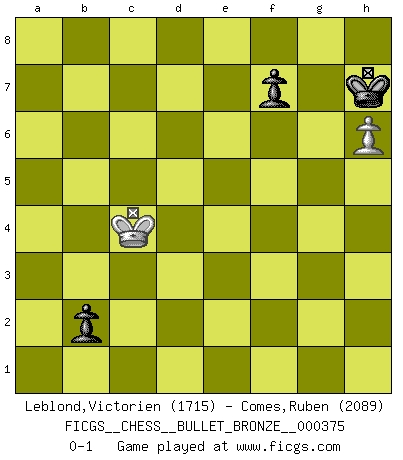 Last move : 0-1 2010 June 22 18:23:44 [Event "FICGS__CHESS__BULLET_BRONZE__000375"] [Site "FICGS"] [Date "2010.06.22"] [Round "1"] [White "Leblond,Victorien"] [Black "Comes,Ruben"] [Result "0-1"] [WhiteElo "1715"] [BlackElo "2089"] 1.Nf3 c5 2.g3 Nf6 3.Bg2 Nc6 4.c3 d5 5.d4 e6 6.O-O Be7 7.dxc5 Bxc5 8.Bf4 h6 9.Na3 Qe7 10.b4 Bb6 11.Ne5 O-O 12.Nc2 Nxe5 13.Bxe5 a5 14.a4 Bc7 15.Qd4 Bxe5 16.Qxe5 axb4 17.cxb4 Bd7 18.a5 Rfc8 19.Qb2 Rc4 20.Rfb1 Rac8 21.Ne3 Rc3 22.b5 R3c5 23.Qa3 Kf8 24.b6 Bb5 25.Bf3 Ba6 26.Rd1 R5c6 27.Qa4 Nd7 28.Qf4 Rc5 29.Ra2 Kg8 30.Kg2 Nb8 31.Ng4 Bc4 32.R2a1 h5 33.Ne5 g5 34.Qd4 g4 35.Bxg4 hxg4 36.Qxg4+ Kf8 37.Qh5 Ke8 38.Ra3 Nd7 39.Qh8+ Qf8 40.Qxf8+ Nxf8 41.Nd3 Rb5 42.g4 Ng6 43.Kg3 Ne7 44.h4 Nc6 45.h5 Kf8 46.g5 Kg8 47.Rd2 Nxa5 48.Ne5 Nc6 49.Nxc6 bxc6 50.h6 c5 51.Ra7 Rxb6 52.Rc2 Ba6 53.e3 Bd3 54.Rc3 Bg6 55.Kf4 Rb2 56.f3 c4 57.Ke5 Rb3 58.Rxb3 cxb3 59.Rb7 Rc3 60.Kf4 Kh7 61.Rb8 e5+ 62.Kxe5 Rxe3+ 63.Kxd5 Rxf3 64.Kd4 Bc2 65.Rb6 Bf5 66.Rb7 Be6 67.Ke4 Rg3 68.Rb5 Bc4 69.Rb8 Rxg5 70.Kd4 Rb5 71.Rxb5 Bxb5 72.Kc3 Bc4 73.Kxc4 b2 0-1 Comment by player 1 : Victorien Leblond : congrats ! Reti Opening Kingside Castling by player White (move 6) Kingside Castling by player Black (move 11) 10 pieces endgame at move 63 : White KRPPP , Black KRBPP WHITE : King + 1 Rook 3 Pawns BLACK : King + 1 Rook 1 Bishop 2 Pawns 9 pieces endgame at move 63 : White KRPP , Black KRBPP WHITE : King + 1 Rook 2 Pawns BLACK : King + 1 Rook 1 Bishop 2 Pawns 8 pieces endgame at move 69 : White KRP , Black KRBPP WHITE : King + 1 Rook 1 Pawn BLACK : King + 1 Rook 1 Bishop 2 Pawns 7 pieces endgame at move 71 : White KRP , Black KBPP WHITE : King + 1 Rook 1 Pawn BLACK : King + 1 Bishop 2 Pawns 6 pieces endgame at move 71 : White KP , Black KBPP WHITE : King + 1 Pawn BLACK : King + 1 Bishop 2 Pawns 5 pieces endgame at move 73 : White KP , Black KPP WHITE : King + 1 Pawn BLACK : King + 2 Pawns Player Black won this chess game. Follow this game move after move (download)When asked, -How is that you pick better moves than your opponents?, I responded: I'm very glad you asked me that, because, as it happens, there is a very simple answer. I think up my own moves, and I make my opponent think up his. (Alexander Alekhine) Es macht mich traurig, wenn ich sehe, dass Golfprofis mehr verdienen als Schachsportler. Obwohl ich davon überzeugt bin, dass wir Schachspieler viel härter trainieren müssen als die Golfer. (Alexandra Kosteniuk) El Ajedrez es tan inspirador que yo no creo que un buen jugador sea capaz de tener un pensamiento malo durante una partida. (Wilhelm Steinitz) On a dit que l'homme se distingue de l'animal par le fait qu'il achète plus de livres qu'il ne peut en lire. Je voudrais suggérer qu'inclure à la liste des livres quelques livres d'échecs rendrait la distinction manifeste. (Edward Lasker) Now you put water in a cup, it becomes the cup; You put water into a bottle it becomes the bottle; You put it in a teapot it becomes the teapot. Water can flow or it can crash. Be water, my friend. (Bruce Lee)