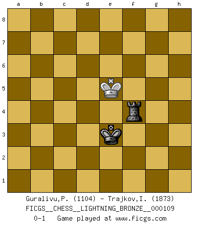 Last move : 0-1 2010 June 22 19:54:36 [Event "FICGS__CHESS__LIGHTNING_BRONZE__000109"] [Site "FICGS"] [Date "2010.06.22"] [Round "1"] [White "Guralivu,Paul-Iosif"] [Black "Trajkov,Ivan"] [Result "0-1"] [WhiteElo "1104"] [BlackElo "1873"] 1.e4 c5 2.Nf3 d6 3.d4 cxd4 4.Nxd4 Nf6 5.Nc3 g6 6.Be3 Bg7 7.f3 a6 8.Qd2 Nbd7 9.O-O-O h5 10.Bg5 Qc7 11.Bd3 b5 12.Rhe1 O-O 13.a3 Rb8 14.Kb1 b4 15.axb4 Rxb4 16.Nb3 Qb8 17.Bh6 Bxh6 18.Qxh6 Ne5 19.Na2 Rb6 20.Be2 Be6 21.Nac1 Bxb3 22.Nxb3 Rc8 23.Rd4 Nfd7 24.f4 Rxc2 25.Kxc2 Rc6+ 26.Kb1 Qxb3 27.Rd2 Qe3 28.R2d1 Rb6 29.Bb5 Ng4 30.Rxe3 Rxb5 31.e5 Nxh6 32.exd6 exd6 33.Rxd6 Nc5 34.g3 Kg7 35.Re5 Ng4 36.Re2 a5 37.Rd5 Nf6 38.Rg5 a4 39.Ka2 Nfd7 40.Rd5 Nb6 41.Rde5 f5 42.Rc2 Nbd7 43.Rd5 h4 44.gxh4 Kh6 45.Rc4 Rb6 46.R4xc5 Nxc5 47.Rxc5 Rb4 48.Ka3 Rxf4 49.h5 Kxh5 50.Rc7 Kg4 51.Rc2 Re4 52.Rg2+ Kh5 53.b4 axb3 54.Kxb3 f4 55.Rd2 f3 56.Kc2 Rg4 57.Kd3 Rg2 58.Rd1 Rxh2 59.Rg1 g5 60.Ke4 f2 61.Rf1 g4 62.Kf4 Kh4 63.Ke3 g3 64.Kf3 Kh3 65.Rd1 f1Q+ 66.Rxf1 Kh4 67.Ra1 Rf2+ 68.Ke3 Kh3 69.Ra7 Kh2 70.Rg7 Rf6 71.Ke2 Kg2 72.Ke3 Kh2 73.Rh7+ Kg1 74.Ke4 g2 75.Ra7 Kh2 76.Rh7+ Kg3 77.Rg7+ Kf2 78.Ke5 Rf3 79.Rxg2+ Kxg2 80.Ke4 Kf2 81.Kd4 Ke2 82.Kd5 Rf4 83.Ke5 Ke3 0-1 Sicilian : Dragon, Yugoslav attack Queenside Castling by player White (move 9) Kingside Castling by player Black (move 12) 10 pieces endgame at move 48 : White KRPPP , Black KRPPP WHITE : King + 1 Rook 3 Pawns BLACK : King + 1 Rook 3 Pawns 9 pieces endgame at move 49 : White KRPP , Black KRPPP WHITE : King + 1 Rook 2 Pawns BLACK : King + 1 Rook 3 Pawns 8 pieces endgame at move 53 : White KRP , Black KRPPP WHITE : King + 1 Rook 1 Pawn BLACK : King + 1 Rook 3 Pawns 7 pieces endgame at move 54 : White KRP , Black KRPP WHITE : King + 1 Rook 1 Pawn BLACK : King + 1 Rook 2 Pawns 6 pieces endgame at move 58 : White KR , Black KRPP WHITE : King + 1 Rook BLACK : King + 1 Rook 2 Pawns Promotion Queen by player Black (move 65) 5 pieces endgame at move 66 : White KR , Black KRP WHITE : King + 1 Rook BLACK : King + 1 Rook 1 Pawn 4 pieces endgame at move 79 : White KR , Black KR WHITE : King + 1 Rook BLACK : King + 1 Rook 3 pieces endgame at move 79 : White K , Black KR WHITE : King + BLACK : King + 1 Rook Player Black won this chess game. Follow this game move after move (download)First-class players lose to second-class players because second-class players sometimes play a first-class game. (Siegbert Tarrasch) Schach sollte überall auf der Welt Schulfach werden. Es fördert die geistige Auseinandersetzung. Es lehrt die Demut in der Niederlage. (Garry Kasparov) Es el objetivo de la escuela moderna no tratar cada posición de acuerdo a una regla general, sino de acuerdo al principio inherente en la posición. (Richard Reti) Plusieurs personnes se sont demandées comment Tal faisait pour gagner... En fait, c'est très simple ! Il met ses pièces au centre de l'échiquier et les sacrifie quelque part ! (David Bronstein) Memory... is the diary that we all carry with us. (Oscar Wilde, The Importance of Being Earnest)