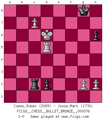 Last move : 1-0 2010 June 22 23:57:48 [Event "FICGS__CHESS__BULLET_BRONZE__000376"] [Site "FICGS"] [Date "2010.06.22"] [Round "1"] [White "Comes,Ruben"] [Black "Josse,Mark"] [Result "1-0"] [WhiteElo "2089"] [BlackElo "1776"] 1.d4 d5 2.e3 Nf6 3.Bd3 c5 4.c3 Qb6 5.f4 Nc6 6.Nf3 Bg4 7.Nbd2 e6 8.O-O Be7 9.Qc2 c4 10.Be2 Bf5 11.Qd1 O-O 12.Nh4 Bd3 13.Bxd3 cxd3 14.Nhf3 a5 15.Ne1 Qa6 16.a4 Ne4 17.Ndf3 b5 18.axb5 Qxb5 19.Qxd3 Qxd3 20.Nxd3 a4 21.Nf2 Nd6 22.Ra2 Rfb8 23.Ne5 Nxe5 24.fxe5 Nc4 25.e4 Rb3 26.exd5 exd5 27.Nd1 Ra5 28.Kf2 a3 29.bxa3 Bxa3 30.Bf4 h6 31.Ke2 Bb4 32.Rc2 Be7 33.Ne3 Nxe3 34.Bxe3 Ra4 35.Kd3 Bd8 36.R2c1 R4a3 37.Bd2 f6 38.exf6 Bxf6 39.Rf5 Rb5 40.Bxh6 Bxd4 41.Kxd4 gxh6 42.c4 Rb2 43.c5 Ra4+ 44.Ke5 d4 45.c6 Re2+ 46.Kd5 Ra5+ 47.Rc5 Rxc5+ 48.Kxc5 Rc2+ 49.Kd6 d3 50.c7 d2 51.Rd5 1-0 Queen's pawn : Stonewall attack Kingside Castling by player White (move 8) Kingside Castling by player Black (move 11) 10 pieces endgame at move 47 : White KRPPP , Black KRRPP WHITE : King + 1 Rook 3 Pawns BLACK : King + 2 Rooks 2 Pawns 9 pieces endgame at move 48 : White KRPPP , Black KRPP WHITE : King + 1 Rook 3 Pawns BLACK : King + 1 Rook 2 Pawns Player White won this chess game. Follow this game move after move (download)He who fears an isolated Queen's Pawn should give up Chess. (Siegbert Tarrasch) Ich organisiere ein großes Turnier, was mich etwa 120000 Dollar kostet. Ich denke, das ist das erste Mal in der Schachgeschichte, daß ein Schachgroßmeister auch als Mäzen auftritt. (Miguel Najdorf) ¡Examina movidas que hagan daño! Un buen ojo for movidas desvastantes es mucho mas importante que el conocimiento de principios estratégicos. (Purdy) Echiquier : carré parfait, comme la Jérusalem nouvelle décrite par l'auteur de l'Apocalypse, huit cases sur huit, exaltation du chiffre 4, symbole du cosmos aux quatre horizons... où le noir et le blanc, l'ombre et la lumière, le mal et le bien s'entremêlent et se conjuguent. (Robert Couffignal, Le Gambit du poète) The modern world has divided itself into Conservatives and Progressives. The business of Progressives is to go on making mistakes. The business of the Conservatives is to prevent the mistakes from being corrected. (G.K. Chesterton)