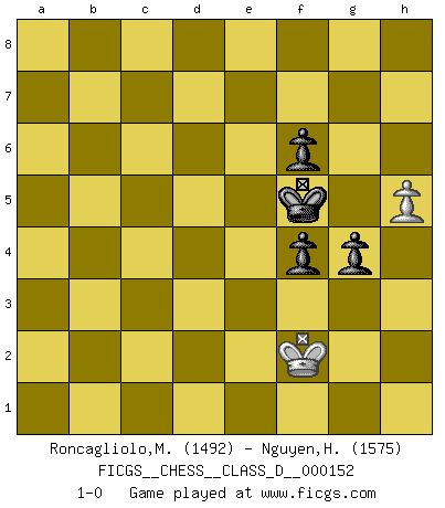 Last move : 1-0 2011 January 20 23:19:11 [Event "FICGS__CHESS__CLASS_D__000152"] [Site "FICGS"] [Date "2010.06.24"] [Round "1"] [White "Roncagliolo,Marco"] [Black "Nguyen,Hao Nhien"] [Result "1-0"] [WhiteElo "1492"] [BlackElo "1575"] 1.e4 e5 2.Nf3 Nc6 3.Bb5 a6 4.Ba4 b5 5.Bb3 Be7 6.c3 Nf6 7.d3 O-O 8.O-O h6 9.h3 d6 10.Nbd2 Na5 11.Bc2 Be6 12.Re1 c5 13.Nf1 Nc6 14.g4 Nd7 15.Ng3 Nb6 16.Kh1 a5 17.Nf5 d5 18.Rg1 dxe4 19.dxe4 Qxd1 20.Nxe7+ Nxe7 21.Rxd1 Ng6 22.Be3 Nd7 23.Rd6 Rfc8 24.Rad1 Ngf8 25.Bb1 b4 26.Nh4 Rc7 27.Ng2 a4 28.f4 a3 29.f5 Bc4 30.b3 Bxb3 31.axb3 a2 32.Bxa2 Rxa2 33.cxb4 cxb4 34.R1d2 Ra3 35.R2d3 Rc3 36.Rxc3 bxc3 37.b4 c2 38.Rc6 Rb3 39.Rxc2 Rxb4 40.g5 hxg5 41.Bxg5 Rxe4 42.Rf2 Nh7 43.Bd2 Nhf6 44.Kh2 Ra4 45.Bc3 Ne4 46.Rf3 Nxc3 47.Rxc3 Nb6 48.Rb3 Nc4 49.Ne3 Nxe3 50.Rxe3 f6 51.Rf3 Kh7 52.Kg3 Kh6 53.Kg2 Kg5 54.Kg3 Rf4 55.Rxf4 exf4+ 56.Kf3 Kxf5 57.h4 g5 58.h5 g4+ 59.Kf2 1-0 Ruy Lopez : Caro variation Kingside Castling by player Black (move 7) Kingside Castling by player White (move 8) 10 pieces endgame at move 49 : White KRPP , Black KRNPPP WHITE : King + 1 Rook 2 Pawns BLACK : King + 1 Rook 1 Knight 3 Pawns 9 pieces endgame at move 50 : White KRPP , Black KRPPP WHITE : King + 1 Rook 2 Pawns BLACK : King + 1 Rook 3 Pawns 8 pieces endgame at move 55 : White KRPP , Black KPPP WHITE : King + 1 Rook 2 Pawns BLACK : King + 3 Pawns 7 pieces endgame at move 55 : White KPP , Black KPPP WHITE : King + 2 Pawns BLACK : King + 3 Pawns 6 pieces endgame at move 56 : White KP , Black KPPP WHITE : King + 1 Pawn BLACK : King + 3 Pawns Player White won this chess game. Follow this game move after move (download)Fischer wanted to give the Russians a taste of their own medicine. (Larry Evans) Verschiedene, sehr schätzbare und im Laufe des Lebens nützliche Eigenschaften des Geistes können durch das Schachspiel erworben und gekräftigt werden, so dass sie zu Gewohnheiten werden, die uns nie im Stich lassen. (Benjamin Franklin) Vive, pierde y aprende al observar a tu oponente como ganar. (Amber Steenbock) Les échecs sont utiles à l'exercice de la faculté de penser et à celle de l'imagination. Car nous devons posséder une méthode élaborée pour atteindre des buts partout où nous devons conduire notre raison. (Leibnitz) History is a gallery of pictures in which there are few originals and many copies. (Alexis de Tocqueville)