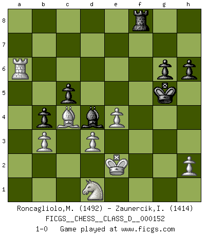 Last move : 1-0 2010 July 25 18:45:18 [Event "FICGS__CHESS__CLASS_D__000152"] [Site "FICGS"] [Date "2010.06.24"] [Round "1"] [White "Roncagliolo,Marco"] [Black "Zaunercik,Ilmar"] [Result "1-0"] [WhiteElo "1492"] [BlackElo "1414"] 1.e4 c5 2.Nf3 d6 3.d4 cxd4 4.Nxd4 Nc6 5.Nc3 Nf6 6.Bc4 g6 7.Be3 Ng4 8.Qd2 Nxe3 9.Qxe3 Bg7 10.Nxc6 bxc6 11.O-O O-O 12.Rad1 Qb6 13.Qxb6 axb6 14.Rd3 b5 15.Bb3 b4 16.Nd1 Ba6 17.Re1 Bxd3 18.cxd3 Bd4 19.Kf1 c5 20.f4 e6 21.Ke2 e5 22.g3 Kg7 23.Rf1 f5 24.Bd5 Rxa2 25.fxe5 dxe5 26.Bxa2 f4 27.gxf4 Ra8 28.Bc4 Kf6 29.fxe5+ Kxe5 30.Rf7 h6 31.Re7+ Kf6 32.Re6+ Kg5 33.Ra6 Rf8 34.b3 1-0 Sicilian Kingside Castling by player White (move 11) Kingside Castling by player Black (move 11) Player White won this chess game. Follow this game move after move (download)You know, comrade Pachman, I don't enjoy being a Minister, I would rather play Chess like you. (Che Guevara) Als er Schachweltmeister wurde ließ er praktisch alle stärksten Sovietspieler für sich arbeiten. Wenn ein auch nur mittelmässiger Meister ein Spezialist für eine bestimmte Eröffnung war, wurde er von Karpov gerufen. Das wurde alles geheim gehalten. (Mikhail Moiseyevich Botvinik) El hombre es un frívolo, una creatura engañosa y como un jugador de Ajedrez, se preocupa mas por el proceso de obtener su meta que de la meta por sí misma. (Dostoyevsky) Des idées, des idées, j'en ai cent, j'en ai mille. Des bonnes, des mauvaises, applicables, irréalisables... Il suffit de faire le tri ! (Roos) Life is pain my dear and anyone who says otherwise is selling something. (Princess Bride)