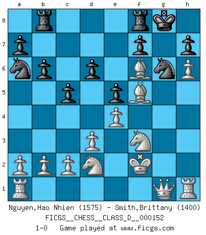 Last move : 1-0 2010 November 16 10:12:9 [Event "FICGS__CHESS__CLASS_D__000152"] [Site "FICGS"] [Date "2010.06.24"] [Round "1"] [White "Nguyen,Hao Nhien"] [Black "Smith,Brittany"] [Result "1-0"] [WhiteElo "1575"] [BlackElo "1400"] 1.e4 c5 2.f4 d6 3.Nf3 Nf6 4.d3 Nbd7 5.h3 Qa5 6.Bd2 e6 7.Bxa5 b6 8.Bc3 Nh5 9.Kf2 Nxf4 10.Nbd2 Ng6 11.Ng5 Be7 12.Ngf3 O-O 13.g3 Nf6 14.g4 Nfe8 15.h4 Nh8 16.g5 Nc7 17.Bh3 Na6 18.h5 Bd7 19.h6 gxh6 20.gxh6 Bf6 21.Bxf6 e5 22.Bxd7 Rab8 23.Qg1+ Ng6 24.Bf5 1-0 This chess game has been lost on time (started : 2010.06.24 2:1:25) Sicilian : Grand Prix attack Kingside Castling by player Black (move 12) Player White won this chess game. Follow this game move after move (download)I believe that Chess possesses a magic that is also a help in advanced age. A rheumatic knee is forgotten during a game of Chess and other events can seem quite unimportant in comparison with a catastrophe on the chessboard. (Vlastimil Hort) Je mehr wir mit Computern analysieren, desto mehr glauben wir an Verteidigung. (Vladimir Kramnik) Bobby Fischer es el mas grande genio de Ajedrez de todos los tiempos. (Alexander Kotov) Les Echecs sont et restent toujours un combat, un combat intégral comme la boxe, la lutte ou un autre sport, et où il doit y avoir un vainqueur et un vaincu. (Joseph Emil Diemer) Statistics can be made to prove anything - even the truth. (Author unknown)