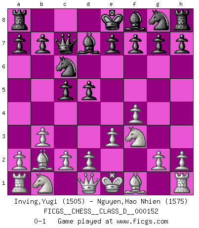 Last move : 0-1 2010 August 6 10:12:25 [Event "FICGS__CHESS__CLASS_D__000152"] [Site "FICGS"] [Date "2010.06.24"] [Round "1"] [White "Inving,Yugi"] [Black "Nguyen,Hao Nhien"] [Result "0-1"] [WhiteElo "1505"] [BlackElo "1575"] 1.b3 d5 2.Bb2 c5 3.e3 Nc6 4.f4 Bd7 5.Nf3 Qc7 0-1 This chess game has been lost on time (started : 2010.06.24 2:1:25) Nimzovich-Larsen attack : Classical variation Player Black won this chess game. Follow this game move after move (download)With or without the title, Bobby Fischer was unquestionably the greatest player of his time. (Burt Hochberg) Computer sind die einzigen Gegner, die nicht immer eine Ausrede auf Lager haben, wenn sie gegen mich verlieren. (Robert James Fischer) No todos los artistas son jugadores de Ajedrez, pero todos los jugadores de Ajedrez son artistas. (Marcel Duchamp) J'ai toujours senti une vague pitié pour l'homme qui ne connaît rien aux échecs, tout comme j'en aurais pour un homme ignorant de l'amour. Les Echecs, comme la musique ou comme l'amour, ont le pouvoir de rendre heureux. (Siegbert Tarrasch) Life is like a play: it's not the length but the excellence of the acting that matters. (Seneca)