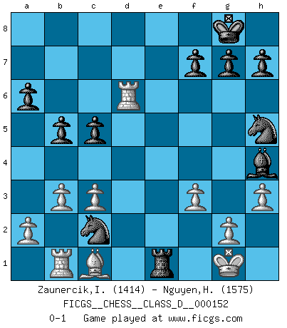 Last move : 0-1 2010 September 12 16:36:31 [Event "FICGS__CHESS__CLASS_D__000152"] [Site "FICGS"] [Date "2010.06.24"] [Round "1"] [White "Zaunercik,Ilmar"] [Black "Nguyen,Hao Nhien"] [Result "0-1"] [WhiteElo "1414"] [BlackElo "1575"] 1.e4 e5 2.Nf3 Nc6 3.Bb5 a6 4.Ba4 b5 5.Bb3 Be7 6.O-O Nf6 7.Re1 O-O 8.c3 d6 9.d3 Na5 10.Bc2 Bg4 11.Nbd2 Qd7 12.Nf1 c5 13.h3 Bh5 14.Ng3 Bg6 15.Nf5 Bxf5 16.exf5 Qxf5 17.d4 e4 18.dxc5 dxc5 19.Nh4 Qe6 20.f3 Rfd8 21.Qe2 Nh5 22.Qxe4 Qxe4 23.Bxe4 Bxh4 24.Rf1 Nc4 25.Bxa8 Rxa8 26.Rd1 Re8 27.b3 Ne3 28.Rd6 Nc2 29.Rb1 Re1+ 0-1 Ruy Lopez : Caro variation Kingside Castling by player White (move 6) Kingside Castling by player Black (move 7) Player Black won this chess game. Follow this game move after move (download)Life is a kind of Chess, with struggle, competition, good and ill events. (Benjamin Franklin) Woher wissen wir, daß der Neanderthaler Blindschach gespielt hat? -- Bei Ausgrabungen wurden keine Schachbretter und Figuren gefunden. (Anonymous) Nunca nadie ha ganado una partida de Ajedrez rindiendose. (Unknown) Ce qui caractérise les parties de combat, c'est que si le défenseur a constamment de difficiles problèmes à résoudre, l'attaquant doit chercher sans relâche de nouvelles possibilités d'attaque. (Koblentz) They say poker is a zero-sum game. It must be, because every time I play my sum ends up zero. (Max Shapiro)