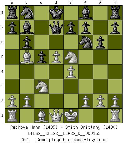 Last move : 0-1 2010 September 20 9:1:0 [Event "FICGS__CHESS__CLASS_D__000152"] [Site "FICGS"] [Date "2010.06.24"] [Round "1"] [White "Pechova,Hana"] [Black "Smith,Brittany"] [Result "0-1"] [WhiteElo "1439"] [BlackElo "1400"] 1.d4 d5 2.c4 c5 3.cxd5 Qxd5 4.Nf3 Nf6 5.Nc3 Qd7 6.d5 b6 7.e4 g6 8.Bb5 Kd8 9.Ne5 Bb7 0-1 This chess game has been lost on time (started : 2010.06.24 2:1:25) QGD : Symmetrical (Austrian) defense Player Black won this chess game. Follow this game move after move (download)Fischer, who may or may not be mad as a hatter, has every right to be horrified. (Jeremy Silman) Ich spiele ehrlich und spiele, um zu gewinnen. Wenn ich verliere nehme ich meine Medizin. (Robert James Fischer) Cuando no sepas que mover, espera por una idea que se le venga a la la cabeza de tu oponente. Tenlo por seguro de que esa idea estará incorrecta. (Siegbert Tarrasch) J'ai vu le vaincu d'Echecs jouer des années durant dans l'espoir de la fête de la victoire. Car tu es plus riche de ce qu'elle existe si même elle n'est point pour toi. Ainsi de la perle du fond des mers. (Antoine de Saint-Exupéry) There is a computer disease that anybody who works with computers knows about. It's a very serious disease and it interferes completely with the work. The trouble with computers is that you 'play' with them ! (Richard P. Feynman)