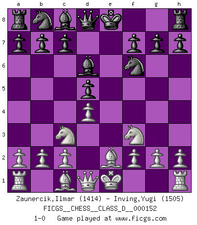 Last move : 1-0 2010 August 6 10:12:25 [Event "FICGS__CHESS__CLASS_D__000152"] [Site "FICGS"] [Date "2010.06.24"] [Round "1"] [White "Zaunercik,Ilmar"] [Black "Inving,Yugi"] [Result "1-0"] [WhiteElo "1414"] [BlackElo "1505"] 1.e4 e6 2.Nf3 d5 3.exd5 exd5 4.d4 Nf6 5.Be2 Bd6 6.Nc3 1-0 This chess game has been lost on time (started : 2010.06.24 2:1:25) French defense Player White won this chess game. Follow this game move after move (download)I give 98 percent of my mental energy to Chess. Others give only 2 percent. (Bobby Fischer) Schach ist wie eine schöne Frau, zu der wir ständig zurückkehren, gleichviel, wie oft sie uns zurückweist. (Anonymous) El arma más poderosa en el Ajedrez, es tener la próxima movida. (David Bronstein) Les Echecs mettent en conflit, non pas deux intelligences, mais deux volontés. (Lasker) If computers get too powerful, we can organize them into committees. That'll do them in. (Anonymous)