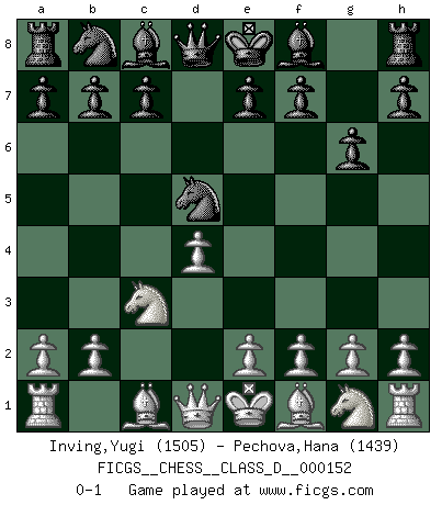 Last move : 0-1 2010 August 27 22:50:2 [Event "FICGS__CHESS__CLASS_D__000152"] [Site "FICGS"] [Date "2010.06.24"] [Round "1"] [White "Inving,Yugi"] [Black "Pechova,Hana"] [Result "0-1"] [WhiteElo "1505"] [BlackElo "1439"] 1.d4 Nf6 2.c4 g6 3.Nc3 d5 4.cxd5 Nxd5 0-1 This chess game has been lost on time (started : 2010.06.24 2:1:25) King's Indian defense, 3.Nc3 Player Black won this chess game. Follow this game move after move (download)White lost because he failed to remember the right continuation and had to think up the moves himself. (Siegbert Tarrasch) Nicht daß Diemer aus Opportunismus Mitglied der NSDAP geworden wäre. Er war ein Fanatiker, in allem, was er tat. (Hans Ree) El Ajedrez es parte de una cultura y si una cultura esta en decadencia, entonces también el Ajedrez declinará. (Mikhail Botvinnik) Echiquier : carré parfait, comme la Jérusalem nouvelle décrite par l'auteur de l'Apocalypse, huit cases sur huit, exaltation du chiffre 4, symbole du cosmos aux quatre horizons... où le noir et le blanc, l'ombre et la lumière, le mal et le bien s'entremêlent et se conjuguent. (Robert Couffignal, Le Gambit du poète) My poor ole parrot... Is not in the circulation of displays ....poo hoo hoo :) (Wayne Lowrance's enigma)