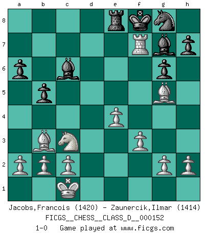 Last move : 1-0 2010 July 16 17:54:2 [Event "FICGS__CHESS__CLASS_D__000152"] [Site "FICGS"] [Date "2010.06.24"] [Round "1"] [White "Jacobs,Francois"] [Black "Zaunercik,Ilmar"] [Result "1-0"] [WhiteElo "1420"] [BlackElo "1414"] 1.e4 c5 2.Nf3 d6 3.d4 cxd4 4.Nxd4 Nc6 5.Nc3 Nf6 6.Be2 g6 7.Be3 Bg7 8.f3 O-O 9.Qd2 Re8 10.Bc4 a6 11.O-O-O b5 12.Nxc6 Qc7 13.Nxe7+ Qxe7 14.Bb3 Bb7 15.Qxd6 Qxd6 16.Rxd6 Rad8 17.Rhd1 Rxd6 18.Rxd6 Kf8 19.Bg5 Ng8 20.Rd7 Bc6 21.Rxf7+ 1-0 Sicilian Kingside Castling by player Black (move 8) Queenside Castling by player White (move 11) Player White won this chess game. Follow this game move after move (download)Help your pieces so they can help you. (Paul Morphy) Viele Opfer benötigen überhaupt keine konkrete Berechnung. Es genügt sich die entstehende Position kurz vorzustellen, um uns davon zu überzeugen, dass das Opfer korrekt ist. (Mikhail Nekhemyevich Tal) Las Aperturas te enseñan aperturas. ¡Los Finales te enseñan Ajedrez!. (Stephan Gerzadowicz) Demandez au pauvre Cg1 ce qu'il en pense. Eduard Gufeld à propos de la variante Saemisch de l'Est-Indienne. Thibault, I ask for draw. Game 13876. - Sorry Ilmars, you won. (FICGS chat)