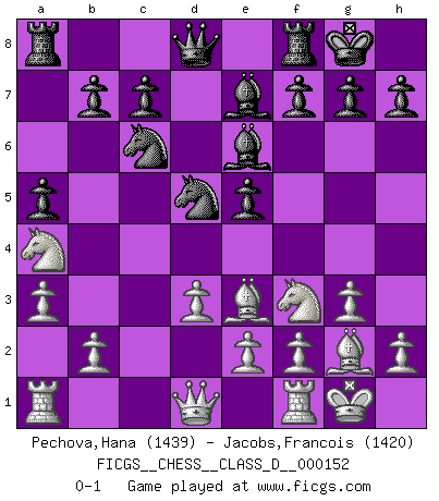 Last move : 0-1 2010 October 10 0:46:55 [Event "FICGS__CHESS__CLASS_D__000152"] [Site "FICGS"] [Date "2010.06.24"] [Round "1"] [White "Pechova,Hana"] [Black "Jacobs,Francois"] [Result "0-1"] [WhiteElo "1439"] [BlackElo "1420"] 1.c4 e5 2.Nc3 Nf6 3.Nf3 Nc6 4.g3 d5 5.cxd5 Nxd5 6.Bg2 Nb6 7.O-O Be7 8.a3 a5 9.d3 O-O 10.Be3 Be6 11.Na4 Nd5 0-1 English Opening Kingside Castling by player White (move 7) Kingside Castling by player Black (move 9) Player Black won this chess game. Follow this game move after move (download)That's what Chess is all about. One day you give your opponent a lesson, the next day he gives you one. (Bobby Fischer) Karpov ist ein Museumsstück. (Garry Kasparov) Desconfianza es la característica mas necesaria de un jugador de Ajedrez. (Siegbert Tarrasch) Il a essayé de se convaincre qu'il pourrait empêcher toutes les erreurs et ne jamais perdre. L'horreur ! Gary Kasparov au sujet de Robert Fischer. I teach you to lie, cheat and steal, and as soon as my back's turned you wait in line ? (Gregory House, House M.D.)