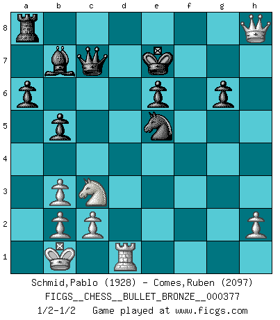 Last move : 1/2-1/2 2010 June 24 8:56:51 [Event "FICGS__CHESS__BULLET_BRONZE__000377"] [Site "FICGS"] [Date "2010.06.24"] [Round "1"] [White "Schmid,Pablo"] [Black "Comes,Ruben"] [Result "1/2-1/2"] [WhiteElo "1928"] [BlackElo "2097"] 1.e4 c5 2.Nc3 d6 3.Nf3 Nf6 4.d4 cxd4 5.Nxd4 a6 6.Bc4 e6 7.Bb3 Nbd7 8.f4 Nc5 9.e5 dxe5 10.fxe5 Nfd7 11.Bf4 b5 12.Qe2 Bb7 13.O-O-O Be7 14.Qg4 g6 15.Bh6 Nxe5 16.Qf4 Qb8 17.Rhf1 Bxg2 18.Rf2 Bb7 19.Kb1 Rg8 20.Bg5 Bxg5 21.Qxg5 h6 22.Qxh6 Nxb3 23.Nxe6 fxe6 24.axb3 Qc7 25.Qh3 Rf8 26.Rxf8+ Kxf8 27.Qh8+ Ke7 28.Qh4+ Ke8 29.Qh8+ Ke7 30.Qh4+ Ke8 31.Qh8+ Ke7 1/2-1/2 Sicilian : Closed Queenside Castling by player White (move 13) This chess game ended in a draw. Follow this game move after move (download)Bobby is the most misunderstood, misquoted celebrity walking the face of this earth. (Yasser Seirawan) Ohne Fehler kann es keine Brillanz geben. (Emanuel Lasker) Las leyes del Ajedrez no permiten una libre elección: tienes que mover quieras o no. (Emanuel Lasker) Avant la finale, les dieux ont créé le milieu de partie. (Tarrasch) A good book on your shelf is a friend that turns its back on you and remains a friend. (Author unknown)
