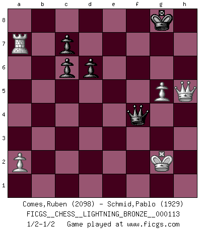 Last move : 1/2-1/2 2010 June 25 20:46:47 [Event "FICGS__CHESS__LIGHTNING_BRONZE__000113"] [Site "FICGS"] [Date "2010.06.25"] [Round "1"] [White "Comes,Ruben"] [Black "Schmid,Pablo"] [Result "1/2-1/2"] [WhiteElo "2098"] [BlackElo "1929"] 1.e4 e5 2.Nf3 Nc6 3.Bb5 f5 4.d3 fxe4 5.dxe4 Nf6 6.O-O Bc5 7.Qd3 d6 8.Nc3 O-O 9.Bxc6 bxc6 10.Qc4+ Kh8 11.Nxe5 Qe8 12.Nd3 Bb6 13.Bg5 Ng4 14.Bh4 Be6 15.Qa4 Nxh2 16.Kxh2 Qh5 17.e5 Bg4 18.Kg3 Bf5 19.Be7 Bxd3 20.Bxf8 Bxf1 21.Bxg7+ Kxg7 22.Rxf1 Kh8 23.Qh4 Qxe5+ 24.f4 Qg7+ 25.Kf3 Rg8 26.g4 Bd4 27.Nd1 Bxb2 28.Nxb2 Qxb2 29.Re1 Qc3+ 30.Re3 Qd4 31.Qe1 Rf8 32.Re4 Qf6 33.Kg3 h5 34.g5 Qf5 35.Qe2 Kg8 36.Ra4 Rf7 37.Qxh5 Qxc2 38.Rxa7 Rxf4 39.Kxf4 Qd2+ 40.Kg3 Qe1+ 41.Kg2 Qd2+ 42.Kf1 Qf4+ 43.Kg2 1/2-1/2 Ruy Lopez : Schliemann defense Kingside Castling by player White (move 6) Kingside Castling by player Black (move 8) 10 pieces endgame at move 39 : White KQRPP , Black KQPPP WHITE : King + 1 Queen 1 Rook 2 Pawns BLACK : King + 1 Queen 3 Pawns This chess game ended in a draw. Follow this game move after move (download)If you aren't afraid of Spassky, then I have removed the element of money. (Jim Slater) Schach ist Leben. (Robert James Fischer) Bobby solo arroja las piezas y solas caen en las casillas correctas. (Miguel Najdorf ) 'L'échange des dames est un coup dur pour les deux adversaires...' Un journaliste lors d'une partie du match Spassky-Fischer Coffee just isn't my cup of tea. (Unknown)