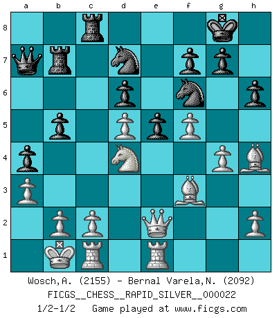 Last move : 1/2-1/2 2010 October 3 17:21:48 [Event "FICGS__CHESS__RAPID_SILVER__000022"] [Site "FICGS"] [Date "2010.06.26"] [Round "1"] [White "Wosch,Arkadiusz"] [Black "Bernal Varela,Nelson"] [Result "1/2-1/2"] [WhiteElo "2155"] [BlackElo "2092"] 1.e4 c5 2.Nf3 d6 3.d4 cxd4 4.Nxd4 Nf6 5.Nc3 a6 6.Be2 e5 7.Nb3 Be6 8.f4 Be7 9.f5 Bd7 10.a3 Bc6 11.Bf3 Nbd7 12.Qe2 b5 13.Be3 h6 14.O-O-O Rb8 15.Ba7 Rb7 16.Bf2 a5 17.Nd5 Bxd5 18.exd5 O-O 19.Rhe1 Qa8 20.Kb1 Bd8 21.Nd2 Bb6 22.Bh4 Rc8 23.g4 Qa7 24.Rc1 Bd4 25.Nb3 Bb6 26.Nd2 Bd4 27.Nb3 a4 28.Nxd4 1/2-1/2 Sicilian : Najdorf, Opovcensky variation Queenside Castling by player White (move 14) Kingside Castling by player Black (move 18) This chess game ended in a draw. Follow this game move after move (download)I feel as if I were a piece in a game of Chess, when my opponent says of it: That piece cannot be moved. (Soren Kierkegaard) Viele Opfer benötigen überhaupt keine konkrete Berechnung. Es genügt sich die entstehende Position kurz vorzustellen, um uns davon zu überzeugen, dass das Opfer korrekt ist. (Mikhail Nekhemyevich Tal) Los finales de Peón son del Ajedrez lo que el cesped es del Golf. (Cecil Purdy) À la honte des hommes, on sait que les lois du jeu sont les seules qui soient partout justes, claires, inviolables et exécutées. Pourquoi l'Indien qui a donné les règles du jeu d'échecs est-il obéi de bon gré dans toute la terre, et que les décrétales des papes, par exemple, sont aujourd'hui un objet d'horreur et de mépris ? C'est que l'inventeur des échecs combina tout avec justesse pour la satisfaction des joueurs, et que les papes, dans leurs décrétales, n'eurent en vue que leur seul avantage. L'Indien voulut exercer également l'esprit des hommes et leur donner du plaisir; les papes ont voulu abrutir l'esprit des hommes. Voltaire (Dictionnaire philosophique / Garnier 1967) If things go wrong, don't go with them. (Roger Babson)