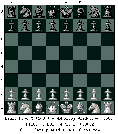 Last move : 0-1 2006 December 5 23:9:0 [Event "FICGS__CHESS__RAPID_B__000022"] [Site "FICGS"] [Date "2006.11.05"] [Round "1"] [White "Laulu,Robert"] [Black "Makosiej,Wladyslaw"] [Result "0-1"] [WhiteElo "1400"] [BlackElo "1600"] 0-1 This chess game has been lost on time (started : 2006.11.05 19:5:58) Player Black won this chess game. Follow this game move after move (download)In complicated positions, Bobby Fischer hardly had to be afraid of anybody. (Paul Keres) Im Blitz ist es einfacher mit einer Figur weniger anzugreifen, als sich mit einer Mehrfigur zu verteidigen. (Mikhail Nekhemyevich Tal) De eso se trata el Ajedrez. Un día le das una lección a tu oponente y al día siguiente el te da una a tí. (Bobby Fischer) Aux échecs, les retours au sommet sont rares : les dommages psychologiques consécutifs à une défaite sont trop sévères. (Daily Telegraph) Life is like a ten-speed bicycle: most of us have gears we never use. (Charles M. Schulz)