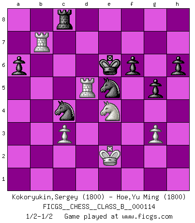 Last move : 1/2-1/2 2010 July 1 17:30:3 [Event "FICGS__CHESS__CLASS_B__000114"] [Site "FICGS"] [Date "2010.06.27"] [Round "1"] [White "Kokoryukin,Sergey"] [Black "Hoe,Yu Ming"] [Result "1/2-1/2"] [WhiteElo "1800"] [BlackElo "1800"] 1.e4 c5 2.Nf3 d6 3.d4 cxd4 4.Nxd4 Nf6 5.Nc3 a6 6.Bg5 e6 7.f4 Qb6 8.Qd2 Qxb2 9.Rb1 Qa3 10.e5 dxe5 11.fxe5 h6 12.Bh4 Nfd7 13.Ne4 Qxa2 14.Rd1 Qd5 15.Qe3 Qxe5 16.Be2 Bc5 17.Bg3 Bxd4 18.Rxd4 Qa5+ 19.Rd2 O-O 20.Bd6 Nc6 21.Bxf8 Kxf8 22.O-O Qe5 23.Qf2 f6 24.Bf3 Qf4 25.g3 Qc7 26.Bg4 Qb6 27.Bxe6 Qxf2+ 28.Kxf2 Nde5 29.Bd5 Nb4 30.Bb3 Ke7 31.c3 Nbc6 32.Bd5 Ng4+ 33.Ke2 Nxh2 34.Rb1 Ng4 35.Nc5 Nge5 36.Be6 Na5 37.Bxc8 Rxc8 38.Rd5 g5 39.Ne4 Nac4 40.Rxb7+ Ke6 1/2-1/2 Sicilian : Najdorf, 7...Qb6 Kingside Castling by player Black (move 19) Kingside Castling by player White (move 22) This chess game ended in a draw. Follow this game move after move (download)In order to improve your game, you must study the endgame before everything else, for whereas the endings can be studied and mastered by themselves, the middle game and the opening must be studied in relation to the endgame. (Jose Raul Capablanca) Ich weiss nicht was Gott gegen mich auf 1.e4 antworten würde. (Robert James Fischer) Aunque la mayoría de la gente disfruta observar las partidas de los grandes Maestros de ataque, algunos de los jugadores mas notables en la historia han sido los jugadores silenciosos posicionales. Lentamente ellos te aplastan despojandote de tu espacio, congestionando tus piezas y dejandote virtualmente sin nada que hacer. (Yasser Seirawan) Des combinaisons [dans le jeu d'échecs] pareilles à des mélodies. Je crois entendre pour ainsi dire la musique des coups... (Vladimir Nabokov) Always be a first-rate version of yourself, instead of a second-rate version of somebody else. (Judy Garland)