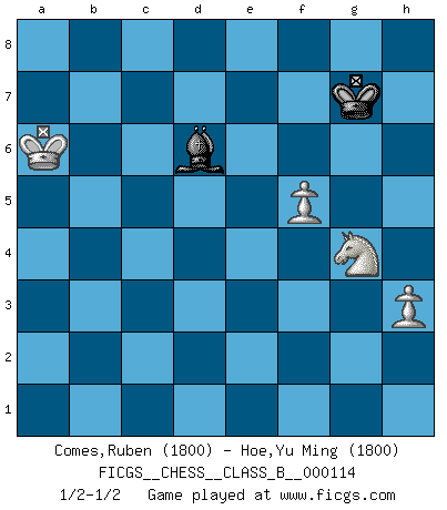 Last move : 1/2-1/2 2010 September 24 16:50:53 [Event "FICGS__CHESS__CLASS_B__000114"] [Site "FICGS"] [Date "2010.06.27"] [Round "1"] [White "Comes,Ruben"] [Black "Hoe,Yu Ming"] [Result "1/2-1/2"] [WhiteElo "1800"] [BlackElo "1800"] 1.e4 c5 2.Nf3 d6 3.d4 cxd4 4.Nxd4 Nf6 5.Nc3 a6 6.f3 e5 7.Nb3 Be6 8.Be3 Be7 9.Qd2 h5 10.Nd5 Nxd5 11.exd5 Bf5 12.Be2 Nd7 13.O-O h4 14.Na5 Qc7 15.h3 O-O 16.c4 Rfe8 17.b4 Nf6 18.Rac1 Qd7 19.Rfd1 Rad8 20.Kh2 Bg6 21.Qe1 Qc7 22.a3 Rd7 23.Bf2 e4 24.Bxh4 Qd8 25.f4 Nxd5 26.Rxd5 Bxh4 27.g3 Be7 28.Rcd1 Qc7 29.Bg4 R7d8 30.f5 Bh7 31.R1d4 Bf6 32.Rxe4 Kf8 33.Qe2 b6 34.Nb3 Rxe4 35.Qxe4 Rc8 36.Nd2 Be5 37.Nf3 Bf6 38.Kg2 Qxc4 39.Qxc4 Rxc4 40.Rxd6 Rc2+ 41.Kf1 Rc3 42.Nd2 Rxa3 43.Rxb6 Ra1+ 44.Ke2 Be5 45.Ne4 Ra2+ 46.Kd3 Ra3+ 47.Kc4 f6 48.Nc5 Bxg3 49.Ne6+ Kg8 50.Rb7 Kh8 51.Re7 Bg8 52.Bh5 Kh7 53.Rxg7+ Kh8 54.Re7 Be1 55.Re8 Rc3+ 56.Kd4 Rg3 57.Kc5 Rc3+ 58.Kb6 Rg3 59.Nc5 Bxb4 60.Ne4 Rg1 61.Bf7 Ba3 62.Rxg8+ Rxg8 63.Bxg8 Kxg8 64.Nxf6+ Kg7 65.Ng4 Be7 66.Kxa6 Bd6 1/2-1/2 Sicilian : Najdorf Kingside Castling by player White (move 13) Kingside Castling by player Black (move 15) 10 pieces endgame at move 62 : White KBNPP , Black KRBPP WHITE : King + 1 Bishop 1 Knight 2 Pawns BLACK : King + 1 Rook 1 Bishop 2 Pawns 9 pieces endgame at move 63 : White KBNPP , Black KBPP WHITE : King + 1 Bishop 1 Knight 2 Pawns BLACK : King + 1 Bishop 2 Pawns 8 pieces endgame at move 63 : White KNPP , Black KBPP WHITE : King + 1 Knight 2 Pawns BLACK : King + 1 Bishop 2 Pawns 7 pieces endgame at move 64 : White KNPP , Black KBP WHITE : King + 1 Knight 2 Pawns BLACK : King + 1 Bishop 1 Pawn 6 pieces endgame at move 66 : White KNPP , Black KB WHITE : King + 1 Knight 2 Pawns BLACK : King + 1 Bishop This chess game ended in a draw. Follow this game move after move (download)Chess is played with the mind and not with the hands ! (Renaud and Kahn) Wir können eben der zündenden Macht des Opfers nicht wiederstehen, denn die Begeisterung für das Opfer liegt in der Natur des Menschen. (Rudolf Spielmann) El Ajedrez es un juego terrible. Si no dominas el centro, tu oponente tiene una posición mas libre. Si tu tienes el centro, entonces realmente tienes algo de que preocuparte. (Siegbert Tarrasch) Demandez au pauvre Cg1 ce qu'il en pense. Eduard Gufeld à propos de la variante Saemisch de l'Est-Indienne. It is not enough to be a good player... you must also play well. (Siegbert Tarrasch)