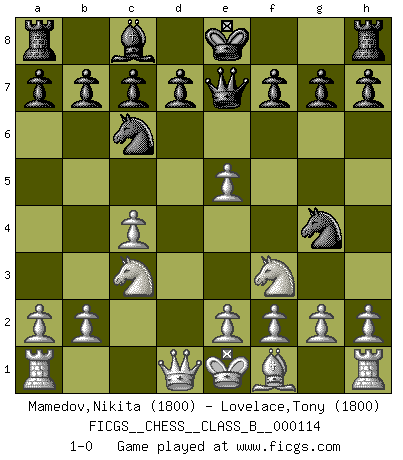 Last move : 1-0 2010 August 8 22:15:36 [Event "FICGS__CHESS__CLASS_B__000114"] [Site "FICGS"] [Date "2010.06.27"] [Round "1"] [White "Mamedov,Nikita"] [Black "Lovelace,Tony"] [Result "1-0"] [WhiteElo "1800"] [BlackElo "1800"] 1.d4 Nf6 2.c4 e5 3.dxe5 Ng4 4.Nf3 Nc6 5.Bg5 Be7 6.Bxe7 Qxe7 7.Nc3 1-0 This chess game has been lost on time (started : 2010.06.27 19:1:58) Budapest : Adler variation Player White won this chess game. Follow this game move after move (download)It began to feel as though you were playing against Chess itself. - On playing against Robert Fischer. (Walter Shipman) Ich habe die Schachforschung dermaßen betrieben, dass sie auf eine wissenschaftliche Basis gestellt wurde. (Mikhail Moiseyevich Botvinik) Tu cuerpo tiene que estar en óptima condición. Tu Ajedrez se deteriora como lo hace tu cuerpo. No puedes separar la mente y el cuerpo. (Bobby Fischer) Le système Elo représente seulement une moyenne. Il est simplement un indicateur de votre stabilité. (Anatoli Karpov) Better than a thousand days of diligent study is one day with a great teacher. (Japanese proverb)