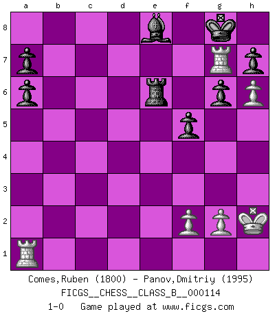 Last move : 1-0 2010 July 16 9:48:47 [Event "FICGS__CHESS__CLASS_B__000114"] [Site "FICGS"] [Date "2010.06.27"] [Round "1"] [White "Comes,Ruben"] [Black "Panov,Dmitriy"] [Result "1-0"] [WhiteElo "1800"] [BlackElo "1995"] 1.e4 e5 2.Nf3 Nf6 3.d4 Nxe4 4.Bd3 d5 5.Nxe5 Nd7 6.Nxd7 Bxd7 7.O-O Bd6 8.c4 c6 9.cxd5 cxd5 10.Nc3 Nxc3 11.bxc3 O-O 12.Qh5 f5 13.Qf3 Kh8 14.Bd2 Qa5 15.Rfe1 Rae8 16.a4 g6 17.h4 Qd8 18.Bg5 Qa5 19.Bb5 Bxb5 20.Qxd5 Qxc3 21.Rec1 Bh2+ 22.Kxh2 Bc6 23.Qd6 Qb3 24.Re1 Kg8 25.Bh6 Rd8 26.Qe7 Qf7 27.Bxf8 Qxf8 28.a5 Qxe7 29.Rxe7 Rxd4 30.a6 bxa6 31.h5 Re4 32.Rc7 Be8 33.h6 Re6 34.Rg7+ 1-0 Petrov : Modern attack, Symmetrical variation Kingside Castling by player White (move 7) Kingside Castling by player Black (move 11) Player White won this chess game. Follow this game move after move (download)Chess is a more highly symbolic game, but the aggressions are therefore even more frankly represented in the play. It probably began as a war game; that is, the representation of a miniature battle between the forces of two kingdoms. (Karl Meninger) Sie bekommen vielleicht den Eindruck, dass die Spitzenspieler überhaupt gar nicht so stark sind. Aber das stimmt nicht. Es ist eine Illusion. Mit einem Computer an der Seite ist es sehr leicht, Urteile zu fällen, aber wenn man alleine am Brett sitzt, sieht die Sache ganz anders aus. (Vladimir Kramnik) El Ajedrez es despiadado: debes de estar preparado para matar gente. (Nigel Short) Je fais ceci parce que dans cinquante coups j'obtiendrai cela; je m'appelle Mikhail Moisevitch Botvinnik. (Botvinnik) Be who you are, and say what you feel because those who mind don't matter, and those who matter don't mind. (Dr Seuss)