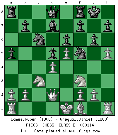 Last move : 1-0 2010 August 14 18:43:22 [Event "FICGS__CHESS__CLASS_B__000114"] [Site "FICGS"] [Date "2010.06.27"] [Round "1"] [White "Comes,Ruben"] [Black "Greguol,Daniel"] [Result "1-0"] [WhiteElo "1800"] [BlackElo "1800"] 1.e4 c5 2.Nf3 g6 3.c3 Bg7 4.d4 cxd4 5.cxd4 d5 6.e5 e6 7.h4 Ne7 8.h5 O-O 9.Nc3 Nbc6 10.Bf4 a5 11.Qd2 Bd7 12.Bh6 Bxh6 13.Qxh6 Nf5 14.Qd2 1-0 Sicilian : Hungarian variation Kingside Castling by player Black (move 8) Player White won this chess game. Follow this game move after move (download)The sign of a great Master is his ability to win a won game quickly and painlessly. (Irving Chernev) Kein Großmeister ist normal. Sie unterscheiden sich nur im Ausmaß Ihrer Verrücktheit. (Viktor Kortschnoi) La táctica fluye a partir de una posición superior. (Bobby Fischer) Toute estimation doit être constamment réévaluée. (Jacob Estrin) If only people were all showed a certain minimum level of niceness; if only people didn't retract verbal draw offers (without draw box ticked) on ficgs; if only people didn't kill; if only people didn't run concentration / extermination camps, if only people didn't drop nuclear bombs on Hiroshima and Nagasaki, and so on - it would be a much more beautiful world. But sadly, things are not so... (Normajean Yates)