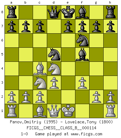 Last move : 1-0 2010 August 8 22:15:36 [Event "FICGS__CHESS__CLASS_B__000114"] [Site "FICGS"] [Date "2010.06.27"] [Round "1"] [White "Panov,Dmitriy"] [Black "Lovelace,Tony"] [Result "1-0"] [WhiteElo "1995"] [BlackElo "1800"] 1.e4 d5 2.exd5 Nf6 3.Bb5+ Bd7 4.Bc4 Bg4 5.f3 Bf5 6.Nc3 Nbd7 7.Nge2 Nb6 8.d3 Nbxd5 9.Nd4 1-0 This chess game has been lost on time (started : 2010.06.27 19:1:58) Scandinavian defense Player White won this chess game. Follow this game move after move (download)When you are lonely, when you feel yourself an alien in the world, play Chess. This will raise your spirits and be your counselor in war. (Aristotle) Oft bringt ein stiller Zug das Erdbeben. (Richard Reti) Uno no tiene que jugar muy bien, es suficiente jugar mejor que el oponente. (Siegbert Tarrasch) Les Echecs ne sont pas pour les âmes timides. Ils requièrent un homme entier, qui ne s'arrête pas aveuglément à ce qui a été déjà établi, mais qui tente individuellement de sonder les profondeurs du jeu. (W. Steinitz) If you ain't just a little scared when you enter a casino, you are either very rich or you haven't studied the games enough. (Pappy)