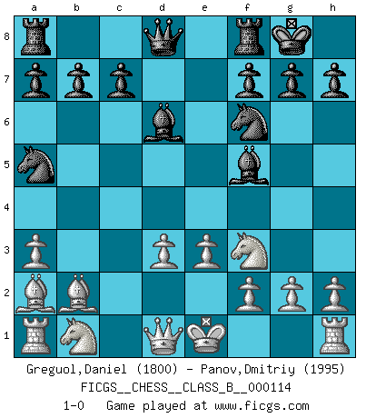 Last move : 1-0 2010 October 7 21:27:41 [Event "FICGS__CHESS__CLASS_B__000114"] [Site "FICGS"] [Date "2010.06.27"] [Round "1"] [White "Greguol,Daniel"] [Black "Panov,Dmitriy"] [Result "1-0"] [WhiteElo "1800"] [BlackElo "1995"] 1.b4 e5 2.Bb2 Bxb4 3.Bxe5 Nf6 4.Nf3 Nc6 5.Bb2 d5 6.e3 O-O 7.a3 Bd6 8.c4 dxc4 9.Bxc4 Na5 10.Ba2 Bf5 11.d3 1-0 Polish (Sokolsky) opening Kingside Castling by player Black (move 6) Player White won this chess game. Follow this game move after move (download)Fischer was a master of clarity and a king of artful positioning. His opponents would see where he was going but were powerless to stop him. (Bruce Pandolfini) Wenn ein Kopf und ein Buch zusammenstoßen und es klingt hohl, ist es denn allemal im Buche? (Georg Christoph Lichtenberg) Prefiero perder una partida realmente buena, que ganar una mala. (David Levy) Vous savez, camarade Pachman, je n'éprouve pas de plaisir à être ministre, je jouerais plutôt aux échecs comme vous, ou alors ferais une révolution au Venezuela. (Che Guevara à Ludek Pachman, 'Checkmate in Prague', 1975) We're missing something. (Gregory House, House M.D.)