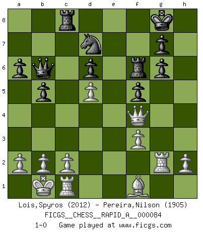Last move : 1-0 2010 August 29 10:51:35 [Event "FICGS__CHESS__RAPID_A__000084"] [Site "FICGS"] [Date "2010.06.27"] [Round "1"] [White "Lois,Spyros"] [Black "Pereira,Nilson"] [Result "1-0"] [WhiteElo "2012"] [BlackElo "1905"] 1.e4 c5 2.Nf3 d6 3.d4 cxd4 4.Nxd4 Nf6 5.Nc3 a6 6.Be3 e5 7.Nb3 Be6 8.f3 Be7 9.Qd2 O-O 10.O-O-O Nbd7 11.g4 b5 12.g5 Nh5 13.Nd5 Bxd5 14.exd5 f6 15.g6 hxg6 16.Na5 Qe8 17.Rg1 f5 18.Nc6 Bd8 19.Qb4 Rf6 20.Nxd8 Qxd8 21.Kb1 Rc8 22.Rc1 Nf4 23.Bxf4 exf4 24.Qxf4 Qb6 25.Rg2 1-0 This chess game has been lost on time (started : 2010.06.27 19:10:57) Sicilian : Najdorf, Byrne (English) attack Kingside Castling by player Black (move 9) Queenside Castling by player White (move 10) Player White won this chess game. Follow this game move after move (download)Chess is a fairy tale of 1001 blunders. (Savielly Tartakower) Schach ist Leben. (Robert James Fischer) El Ajedrez es tan interesante por sí solo, que no es necesario un interés monetario para persuadir a una persona a que lo practique; por lo tanto, nunca se juega por dinero. (Benjamin Franklin) On peut tirer plus d'utilité d'une partie perdue que de 100 parties gagnées. (Capablanca) They misunderestimated me. (George W. Bush, Bentonville nov. 6, 2000)