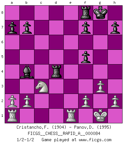 Last move : 1/2-1/2 2010 July 31 3:52:6 [Event "FICGS__CHESS__RAPID_A__000084"] [Site "FICGS"] [Date "2010.06.27"] [Round "1"] [White "Cristancho,Fernando"] [Black "Panov,Dmitriy"] [Result "1/2-1/2"] [WhiteElo "1904"] [BlackElo "1995"] 1.e4 e5 2.Nf3 Nf6 3.d4 Nxe4 4.Bd3 d5 5.Nxe5 Nd7 6.Nxd7 Bxd7 7.O-O Bd6 8.c4 c6 9.cxd5 cxd5 10.Qh5 O-O 11.Qxd5 Bc6 12.Qh5 g6 13.Qh3 Ng5 14.Bxg5 Qxg5 15.Nc3 Rad8 16.Be4 Bxe4 17.Nxe4 Qf4 18.Rfe1 Bb4 19.g3 Qf5 20.Qxf5 gxf5 21.Nc3 Rxd4 1/2-1/2 Petrov : Modern attack, Symmetrical variation Kingside Castling by player White (move 7) Kingside Castling by player Black (move 10) This chess game ended in a draw. Follow this game move after move (download)That's what Chess is all about. One day you give your opponent a lesson, the next day he gives you one. (Bobby Fischer) Schach ist ein schwarz-weisser Dschungel. (Garry Kasparov) El Ajedrez es sobre todo, ¡una pelea!. (Emanuel Lasker) RxDa4 pat (...) He who fights with monsters should be careful lest he thereby become a monster. (Friedrich Nietzsche, Beyond Good and Evil)