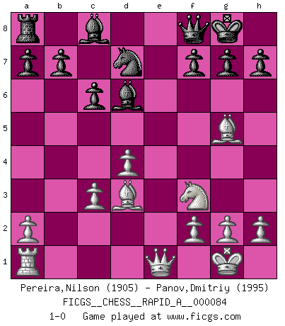 Last move : 1-0 2010 September 8 11:27:33 [Event "FICGS__CHESS__RAPID_A__000084"] [Site "FICGS"] [Date "2010.06.27"] [Round "1"] [White "Pereira,Nilson"] [Black "Panov,Dmitriy"] [Result "1-0"] [WhiteElo "1905"] [BlackElo "1995"] 1.e4 e5 2.Nf3 Nf6 3.Nxe5 d6 4.Nf3 Nxe4 5.d4 d5 6.Bd3 Bd6 7.O-O O-O 8.c4 c6 9.Re1 Re8 10.Nc3 Nxc3 11.bxc3 dxc4 12.Bg5 Rxe1+ 13.Qxe1 Qf8 14.Bxc4 Nd7 15.Bd3 1-0 This chess game has been lost on time (started : 2010.06.27 19:10:57) Petrov : Classical attack, Marshall variation Kingside Castling by player White (move 7) Kingside Castling by player Black (move 7) Player White won this chess game. Follow this game move after move (download)I'm not afraid of Spassky. The world knows I'm the best. You don't need a match to prove it. (Bobby Fischer) Ich kämpfe solange mein Gegner einen Fehler machen kann. (Emanuel Lasker) Debió haber existido una vez en que los hombres eran semidióses, de otra manera no hubiesen podido inventar el Ajedrez. (Gustav Schenk) Assurément je connaissais par expérience le mystérieux attrait de ce jeu royal, le seul entre tous les jeux inventés par les hommes qui échappe souverainement à la tyrannie du hasard, le seul où l'on ne doive sa victoire qu'à son intelligence ou plutôt à une certaine forme d'intelligence. Mais n'est-ce pas déjà le limiter injurieusement que d'appeler les échecs un jeu ? N'est-ce pas une science, un art ou quelque chose qui, comme le cercueil de Mahomet entre ciel et terre, est suspendu entre l'un et l'autre, et qui réunit un nombre incroyable de contraires ? [...] C'est une pensée qui ne mène à rien, une mathématique qui n'établit rien, un art qui ne laisse pas d'uvre, une architecture sans matière; et il l'a prouvé néanmoins qu'il était plus durable, à sa manière, que les livres ou que tout autre monument, ce jeu unique qui appartient à tous les peuples et à tous les temps, et dont personne ne sait quel dieu en fit don à la terre pour tuer l'ennui, pour aiguiser l'esprit et stimuler l'âme. Où commence-t-il, où finit-il ? (Stefan Zweig) The Internet isn't free. It just has an economy that makes no sense to capitalism. (Brad Shapcott)