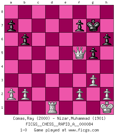 Last move : 1-0 2010 September 3 23:6:54 [Event "FICGS__CHESS__RAPID_A__000084"] [Site "FICGS"] [Date "2010.06.27"] [Round "1"] [White "Comas,Ray"] [Black "Nizar,Muhammad"] [Result "1-0"] [WhiteElo "2000"] [BlackElo "1901"] 1.e4 c5 2.Nc3 d6 3.Nge2 Nc6 4.g3 Nf6 5.Bg2 g6 6.O-O Bg7 7.Nd5 O-O 8.c3 e6 9.Nxf6+ Bxf6 10.d3 d5 11.Bh6 Re8 12.exd5 exd5 13.Nf4 d4 14.Qb3 Bg7 15.Bxg7 Kxg7 16.Rae1 g5 17.Rxe8 Qxe8 18.Nd5 Rb8 19.Qb5 Qe2 20.cxd4 Nxd4 21.Qxc5 Qxd3 22.Ne3 Ne2+ 23.Kh1 Qf5 24.Nxf5+ Bxf5 25.Qe5+ Kg6 26.Qxb8 Nd4 27.Qg8+ Kf6 28.Qh8+ Kg6 29.Qxd4 b6 30.Be4 Bxe4+ 31.Qxe4+ Kg7 32.Qf5 h6 33.Rd1 1-0 This chess game has been lost on time (started : 2010.06.27 19:10:57) Sicilian : Closed Kingside Castling by player White (move 6) Kingside Castling by player Black (move 7) Player White won this chess game. Follow this game move after move (download)The game of Chess is not merely an idle amusement; several very valuable qualities of the mind are to be acquired and strengthened by it, so as to become habits ready on all occasions; for life is a kind of Chess. (Benjamin Franklin) Dass jemand wie Surab Asmaiparaschwili, der selbst Elopunkte gekauft hat , Vize-Präsident der Fide werden konnte, sagt schon einges über den Zustand dieser Organisation aus. (Joel Lautier) Vive, pierde y aprende al observar a tu oponente como gana. (Amber Steenbock) Psychologiquement, tu dois avoir confiance en toi même, mais cette confiance doit être basée sur des faits. (Robert Fischer) Perhaps chess is the wrong game for the times (The Chess Master and the Computer, by Garry Kasparov - 2010)