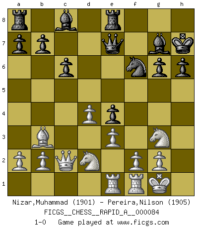 Last move : 1-0 2010 September 25 9:6:35 [Event "FICGS__CHESS__RAPID_A__000084"] [Site "FICGS"] [Date "2010.06.27"] [Round "1"] [White "Nizar,Muhammad"] [Black "Pereira,Nilson"] [Result "1-0"] [WhiteElo "1901"] [BlackElo "1905"] 1.d4 Nf6 2.c4 e6 3.Nf3 d5 4.Nc3 c6 5.Bg5 h6 6.Bxf6 Qxf6 7.e3 Nd7 8.Bd3 dxc4 9.Bxc4 g6 10.O-O Bg7 11.Qc2 O-O 12.Ne4 Qe7 13.Bb3 e5 14.Ng3 Kh7 15.h4 Re8 16.h5 e4 17.Nd2 Nf6 18.hxg6+ fxg6 19.Rae1 1-0 This chess game has been lost on time (started : 2010.06.27 19:10:57) Queen's pawn game Kingside Castling by player White (move 10) Kingside Castling by player Black (move 11) Player White won this chess game. Follow this game move after move (download)In Fischer's hands, a slight theoretical advantage is as good a being a Queen ahead. (Isaac Kashdan) Modernes Schach sorgt sich zuviel um Dinge wie Bauernstruktur usw. Vergessen Sie das, Schachmatt beendet das Spiel! (Nigel Short) Prefiero perder una partida realmente buena, que ganar una mala. (David Levy) Il vaut toujours mieux jouer un plan faux de façon logique que de n'avoir pas de plan du tout. (Victor Kortchnoï) The mind is like a parachute, it only functions when its open. (Unknown)