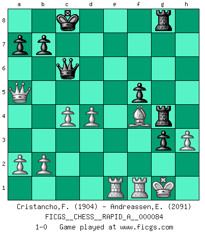 Last move : 1-0 2010 July 7 23:15:1 [Event "FICGS__CHESS__RAPID_A__000084"] [Site "FICGS"] [Date "2010.06.27"] [Round "1"] [White "Cristancho,Fernando"] [Black "Andreassen,Einar"] [Result "1-0"] [WhiteElo "1904"] [BlackElo "2091"] 1.e4 d5 2.exd5 Nf6 3.d4 c6 4.dxc6 Nxc6 5.Nf3 e5 6.Bb5 Bd7 7.Bxc6 Bxc6 8.Nxe5 Qc7 9.O-O O-O-O 10.Bf4 Bd6 11.Nd2 h5 12.Ndc4 Nd5 13.Nxd6+ Qxd6 14.Bg5 Rdf8 15.c4 Nf6 16.Bf4 Ng4 17.Qd2 g5 18.Nxc6 Qxc6 19.Bxg5 Rfg8 20.f3 f6 21.Bf4 f5 22.fxg4 Rxg4 23.Rae1 Rhg8 24.g3 h4 25.Qa5 hxg3 26.h3 1-0 Scandinavian defense Kingside Castling by player White (move 9) Queenside Castling by player Black (move 9) Player White won this chess game. Follow this game move after move (download)The defensive power of a pinned piece is only imaginary. (Aaron Nimzovich) Es ist nicht das erste mal, dass sich die FIDE dem Arabischen Geld gebeugt hat (über die FIDE WM 2004 in Lybien). (Larry Evans) Las ideas audaces son como las piezas del Ajedrez que avanzan hacia adelante. Ellas pueden ser vencidas, pero también pueden iniciar una partida victoriosa. (Goethe) Ce n'est pas pour s'amuser qu'il joue aux échecs : il célèbre un culte. (Vladimir Nabokov) The smarter you play, the luckier you'll be. (Mark Pilarski)