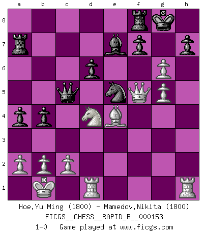 Last move : 1-0 2010 July 25 17:31:47 [Event "FICGS__CHESS__RAPID_B__000153"] [Site "FICGS"] [Date "2010.06.27"] [Round "1"] [White "Hoe,Yu Ming"] [Black "Mamedov,Nikita"] [Result "1-0"] [WhiteElo "1800"] [BlackElo "1800"] 1.e4 c5 2.Nf3 d6 3.d4 cxd4 4.Nxd4 Nf6 5.Nc3 a6 6.Be3 e5 7.Nb3 Be7 8.f3 Be6 9.Qd2 Nbd7 10.g4 Qc7 11.O-O-O O-O 12.Kb1 b5 13.g5 Nh5 14.f4 exf4 15.Bxf4 Nxf4 16.Qxf4 Ne5 17.Nd4 Qc5 18.h4 b4 19.Nd5 Bxd5 20.exd5 Qxd5 21.Bh3 Qc5 22.h5 a5 23.Bf5 a4 24.Be4 Ra7 25.Qf5 g6 26.hxg6 1-0 Sicilian : Najdorf, Byrne (English) attack Queenside Castling by player White (move 11) Kingside Castling by player Black (move 11) Player White won this chess game. Follow this game move after move (download)I like the moment when I break a man's ego. (Bobby Fischer) Im Internet Chess Club betrug mein Rating vorübergehend 3350 ELO-Punkte. (Sergej Karjakin) Alguna parte de un error es siempre correcto. (Savielly Tartakover) Avec des compensations pour le matériel en plus... (Anonyme) He who is a good ruler must first have been ruled. (Aristotle)