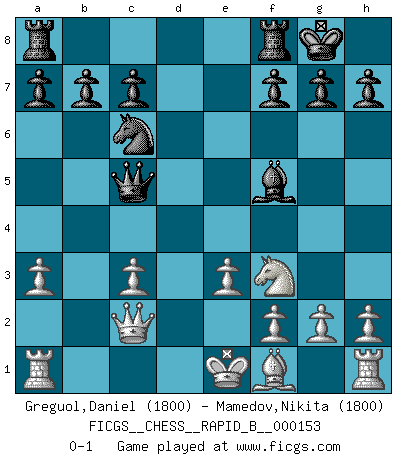 Last move : 0-1 2010 August 14 18:43:8 [Event "FICGS__CHESS__RAPID_B__000153"] [Site "FICGS"] [Date "2010.06.27"] [Round "1"] [White "Greguol,Daniel"] [Black "Mamedov,Nikita"] [Result "0-1"] [WhiteElo "1800"] [BlackElo "1800"] 1.b4 e5 2.Bb2 Bxb4 3.Bxe5 Nf6 4.Nf3 O-O 5.a3 Ba5 6.e3 d5 7.c4 Nc6 8.Bb2 Ne4 9.cxd5 Qxd5 10.Nc3 Nxc3 11.Bxc3 Bxc3 12.dxc3 Qc5 13.Qc2 Bf5 0-1 Polish (Sokolsky) opening Kingside Castling by player Black (move 4) Player Black won this chess game. Follow this game move after move (download)Via the squares on the chessboard, the Indians explain the movement of time and the age, the higher influences which control the world and the ties which link Chess with the human soul. (Al-Masudi) Der Knackpunkt bei der Konzentration ist, daß wir nur durch sie etwas Neues und Ungewöhnliches am Schachbrett finden können. Sie ist der einzige Weg durch neue neue Ideen eine Überraschung zu bereiten. (Garry Kasparov) Si el Ajedrez es una ciencia, es la mas inexacta. Si el Ajedrez es un arte, es demasiado inexacto para ser visto como tal. Si el Ajedrez es un deporte, es demasiado esotérico. Si el Ajedrez es un juego, es demasiado exigente para ser solo un juego. Si el Ajedrez es una aventura, es una muy demandante. Si el Ajedrez es una pasión, es una muy gratificante. Si el Ajedrez es la vida, es una muy triste. (Anónimo) Donnez-moi un Cavalier en 6e et je gagnerais toutes mes parties. (Steinitz) It is not true that people stop pursuing dreams because they grow old, they grow old because they stop pursuing dreams. (Gabriel Garcia Marquez)