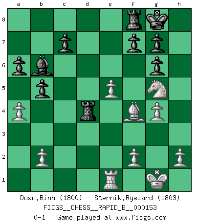 Last move : 0-1 2010 July 11 5:2:7 [Event "FICGS__CHESS__RAPID_B__000153"] [Site "FICGS"] [Date "2010.06.27"] [Round "1"] [White "Doan,Binh"] [Black "Sternik,Ryszard"] [Result "0-1"] [WhiteElo "1800"] [BlackElo "1803"] 1.e4 e5 2.Nf3 Nc6 3.Bb5 a6 4.Ba4 Nf6 5.O-O Nxe4 6.d4 b5 7.Bb3 d5 8.dxe5 Be6 9.Nbd2 Nc5 10.c3 d4 11.Bxe6 Nxe6 12.cxd4 Ncxd4 13.a4 Bc5 14.Ne4 Bb6 15.Nfg5 Qd5 16.Nxe6 Qxe6 17.Re1 O-O 18.Bf4 Rad8 19.Qh5 Nc2 20.Ng5 Qf5 21.g4 Qg6 22.Qxg6 hxg6 23.Rac1 Nxe1 24.Rxe1 Rd4 0-1 Ruy Lopez : Open, 7.Bb3 Kingside Castling by player White (move 5) Kingside Castling by player Black (move 17) Player Black won this chess game. Follow this game move after move (download)Those who say they understand Chess, understand nothing. (Robert Hubner) Gott hat gewollt, dass ich Champion werde. (Surab Azmajparaschvili) El Ajedrez era la lengua materna de Capablanca. (Reti) Nous sommes les pions de la mystérieuse partie d'Echecs jouée par Dieu. Il nous déplace, nous arrête, nous pousse encore, puis nous lance un à un dans la boîte du Néant. Epitaphe sur la tombe de David Janowsky (1868-1927). Computers are like Old Testament gods; lots of rules and no mercy. (Joseph Campbell)