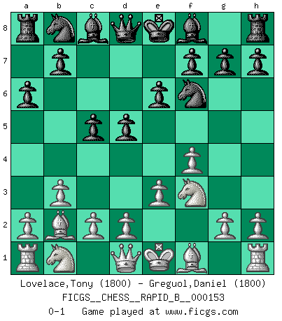 Last move : 0-1 2010 August 6 22:12:30 [Event "FICGS__CHESS__RAPID_B__000153"] [Site "FICGS"] [Date "2010.06.27"] [Round "1"] [White "Lovelace,Tony"] [Black "Greguol,Daniel"] [Result "0-1"] [WhiteElo "1800"] [BlackElo "1800"] 1.f4 d5 2.b3 Nf6 3.e3 c5 4.Bb2 e6 5.Nf3 a6 0-1 This chess game has been lost on time (started : 2010.06.27 19:39:59) Bird's Opening Player Black won this chess game. Follow this game move after move (download)Chess is like war on a board. (Bobby Fischer) Ich hatte Angst gegen einen russischen Großmeister zu verlieren, und er befürchtete gegen einen kleinen Jungen zu verlieren. (über ein Remis gegen Juri Awerbach). (Robert James Fischer) El juego del Ajedrez no es solamente una diversión quieta; algunas cualidades muy valuables de la mente se pueden adquirir y cultivar con el, como convertirlos en habitos disponibles para toda ocasión; ya que la vida es algo así como el Ajedrez. (Benjamin Franklin) C'est une question de caractère, Beaucoup de gens perdent leur motivation très vite. D'autres, ils sont rares, peuvent la conserver très longtemps. J'aime les échecs, encore aujourd'hui je suis heureux d'analyser des parties. J'aime toujours gagner, je déteste encore perdre. Bien jouer est important pour mon intégrité intellectuelle et morale. Et puis les échecs vivent en ce moment une période historique grâce à Internet. Ils se développent dans les systèmes éducatifs à travers le monde. Ils sortent de leur ghetto, et c'est mon rôle de mener à bien cette révolution. (Gary Kasparov) It's unlucky to be superstitious. (Dave Enteles)