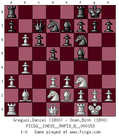 Last move : 1-0 2010 August 3 2:50:0 [Event "FICGS__CHESS__RAPID_B__000153"] [Site "FICGS"] [Date "2010.06.27"] [Round "1"] [White "Greguol,Daniel"] [Black "Doan,Binh"] [Result "1-0"] [WhiteElo "1800"] [BlackElo "1800"] 1.b4 d5 2.Bb2 Bf5 3.e3 e6 4.a3 Nf6 5.Nf3 Bd6 6.c4 c6 7.c5 Be7 8.Be2 O-O 9.O-O Nbd7 10.d3 Qc7 11.Nbd2 b6 12.cxb6 1-0 Polish (Sokolsky) opening Kingside Castling by player Black (move 8) Kingside Castling by player White (move 9) Player White won this chess game. Follow this game move after move (download)My opponents make good moves too. Sometimes I don't take these things into consideration. (Bobby Fischer) Der Bart als Geschlechtszeichen mitten im Gesicht ist obszön. Daher gefällt er den Weibern. [Zugegeben, kein Schachzitat, aber unglaublich originell] (Arthur Schopenhauer) El juego de Damas es para vagabundos. (Paul Morphy) J'apprécie les joueurs d'est-indienne, c'est grâce à eux que je nourris ma famille depuis tant d'années. (Petrosian) Never risk one's whole fortune unless supported by one's entire army. (Niccolo Machiavelli)