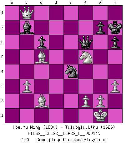 Last move : 1-0 2010 July 17 19:9:28 [Event "FICGS__CHESS__CLASS_C__000149"] [Site "FICGS"] [Date "2010.06.28"] [Round "1"] [White "Hoe,Yu Ming"] [Black "Tuluoglu,Utku"] [Result "1-0"] [WhiteElo "1800"] [BlackElo "1626"] 1.e4 e5 2.Nf3 Nc6 3.Bb5 a6 4.Ba4 Nf6 5.O-O Be7 6.Re1 b5 7.Bb3 d6 8.c3 O-O 9.h3 Nb8 10.d4 Nbd7 11.Nbd2 c6 12.c4 Bb7 13.Bc2 Qc7 14.b3 Rfe8 15.Bb2 Bf8 16.cxb5 axb5 17.a4 bxa4 18.dxe5 dxe5 19.Rxa4 h6 20.Rxa8 Rxa8 21.Nc4 Re8 22.Qa1 Bd6 23.Rd1 Re6 24.Nxd6 Rxd6 25.Rxd6 Qxd6 26.Nxe5 Nc5 27.Nc4 Qe6 28.Qa7 Qe7 29.Ba3 Nfxe4 30.Qb8+ Kh7 31.Nd6 f5 32.Nxf5 Qf6 33.Bxc5 1-0 Ruy Lopez : Closed Kingside Castling by player White (move 5) Kingside Castling by player Black (move 8) Player White won this chess game. Follow this game move after move (download)A thorough understanding of the typical mating continuations makes the most complicated sacrificial combinations leading up to them not only not difficult, but almost a matter of course. (Siegbert Tarrasch) Gewinnen beim Schach fördert das Selbstvertrauen. Beim Sex spüre ich sowas nicht... (Garry Kasparov) Solo puedes ser bueno en el Ajedrez si amas al juego. (Bobby Fischer) On peut tirer plus d'utilité d'une partie perdue que de 100 parties gagnées. (Capablanca) The real danger is not that computers will begin to think like men, but that men will begin to think like computers. (Sydney J. Harris)