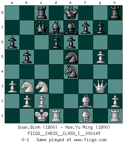 Last move : 0-1 2010 July 14 20:2:1 [Event "FICGS__CHESS__CLASS_C__000149"] [Site "FICGS"] [Date "2010.06.28"] [Round "1"] [White "Doan,Binh"] [Black "Hoe,Yu Ming"] [Result "0-1"] [WhiteElo "1800"] [BlackElo "1800"] 1.Nf3 c5 2.e4 d6 3.d4 cxd4 4.Nxd4 Nf6 5.Nc3 a6 6.Bg5 e6 7.f4 Qb6 8.a3 Nc6 9.Nb3 Be7 10.Qf3 Qc7 11.O-O-O Bd7 12.g4 h6 13.Bh4 Rc8 14.Bf2 b5 15.g5 hxg5 16.fxg5 Ne5 17.Qg3 Nxe4 0-1 Reti Opening Queenside Castling by player White (move 11) Player Black won this chess game. Follow this game move after move (download)You know, comrade Pachman, I don't enjoy being a Minister, I would rather play Chess like you. (Che Guevara) Nach Morphy wurde nichts neues mehr in der Behandlung offener Positionen gefunden. (Mikhail Moiseyevich Botvinik) Las combinaciones han sido siempre el aspecto más intrigante del Ajedrez. Los Maestros las buscan, el público las aplauden, los críticos las alaban. La razón se debe a que las combinaciones hacen posible que el Ajedrez sea más que un ejercicio matemático con una carencia de vida. Ellas son la poesía del juego, son del Ajedrez lo que la melodía es de la música. Ellas representan el triunfo de la mente sobre la materia. (Reuben Fine) La solitude du joueur d'Echecs à l'approche du mat est semblable à celle du condamné. (Francis Szpiner) Be who you are, and say what you feel because those who mind don't matter, and those who matter don't mind. (Dr Seuss)
