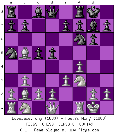 Last move : 0-1 2010 August 9 10:18:44 [Event "FICGS__CHESS__CLASS_C__000149"] [Site "FICGS"] [Date "2010.06.28"] [Round "1"] [White "Lovelace,Tony"] [Black "Hoe,Yu Ming"] [Result "0-1"] [WhiteElo "1800"] [BlackElo "1800"] 1.f4 d5 2.b3 Nf6 3.Bb2 g6 4.Nf3 Bg7 5.e3 O-O 6.Be2 c5 7.O-O Nc6 8.Bb5 Na5 0-1 This chess game has been lost on time (started : 2010.06.28 9:35:33) Bird's Opening Kingside Castling by player Black (move 5) Kingside Castling by player White (move 7) Player Black won this chess game. Follow this game move after move (download)I believe that Chess possesses a magic that is also a help in advanced age. A rheumatic knee is forgotten during a game of Chess and other events can seem quite unimportant in comparison with a catastrophe on the chessboard. (Vlastimil Hort) Ich bewundere Kasparows phantasievolle Angriffssiege aus den Achtzigern und Neunzigern, aber wenn man sie mit dem Computer überprüft, nimmt der Computer in jeder zweiten Partie die Opfer an, verteidigt sich und gewinnt. (Vladimir Kramnik) Un entendimiento a fondo de las continuaciones típicas del mate, hace de las combinaciones de sacrificio mas complicadas conducirlas a ellas no solo sin dificultad, sino casi de una manera natural. (Siegbert Tarrasch) Un journaliste : 'Vous préférez avoir une dame de plus sur l'échiquier ou au lit ?' Boris Spassky : 'Ca dépend de la position.' If things go wrong, don't go with them. (Roger Babson)