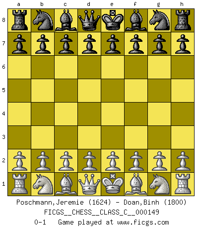 Last move : 0-1 2010 August 7 10:13:54 [Event "FICGS__CHESS__CLASS_C__000149"] [Site "FICGS"] [Date "2010.06.28"] [Round "1"] [White "Poschmann,Jeremie"] [Black "Doan,Binh"] [Result "0-1"] [WhiteElo "1624"] [BlackElo "1800"] 0-1 This chess game has been lost on time (started : 2010.06.28 9:35:33) Player Black won this chess game. Follow this game move after move (download)Modern Chess is too much concerned with things like Pawn structure. Forget it, Checkmate ends the game. (Nigel Short) Ein Kibitz ist einer, der deinem Gegner gute Ratschläge gibt. (Andrew Soltis) No es una movida, aún la mejor movida que tu debas buscar, sino un plan comprensible. (Eugene Znosko-Borovsky) Ce qui caractérise les parties de combat, c'est que si le défenseur a constamment de difficiles problèmes à résoudre, l'attaquant doit chercher sans relâche de nouvelles possibilités d'attaque. (Koblentz) Gambling : The sure way of getting nothing from something. (Wilson Mizner)