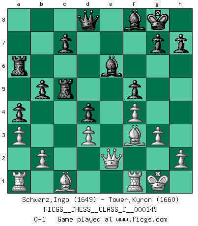 Last move : 0-1 2011 January 21 23:25:31 [Event "FICGS__CHESS__CLASS_C__000149"] [Site "FICGS"] [Date "2010.06.28"] [Round "1"] [White "Schwarz,Ingo"] [Black "Tower,Kyron"] [Result "0-1"] [WhiteElo "1649"] [BlackElo "1660"] 1.g3 Nf6 2.Bg2 d5 3.f3 e5 4.Nh3 Bc5 5.Nf2 e4 6.O-O O-O 7.d4 exd3 8.cxd3 Nc6 9.e3 d4 10.e4 Re8 11.Qc2 Bf8 12.a3 a5 13.Nd2 a4 14.Nc4 b5 15.e5 Nxe5 16.Nxe5 Rxe5 17.f4 Rc5 18.Qe2 Ra6 19.Ne4 Nxe4 20.Bxe4 f5 21.Bf3 Be6 0-1 This chess game has been lost on time (started : 2010.06.28 9:35:33) Benko's Opening Kingside Castling by player White (move 6) Kingside Castling by player Black (move 6) Player Black won this chess game. Follow this game move after move (download)All my games are real. (Bobby Fischer) Ein Springer auf f6 gegen die eigene Rochadestellung ist schlimmer als ein rostiger Nagel im Knie. (Efim Bogoljubov) El Ajedrez es una guerra en un tablero. El objetivo es aplastar la mente del oponente. (Bobby Fischer) La menace est plus forte que l'exécution. (Aaron Nimzovitch) Computers have lots of memory but no imagination. (Anonymous)