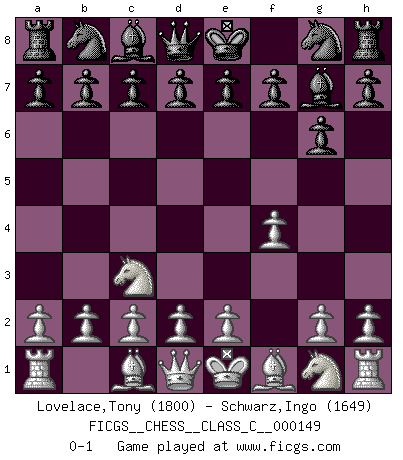Last move : 0-1 2010 August 11 10:31:30 [Event "FICGS__CHESS__CLASS_C__000149"] [Site "FICGS"] [Date "2010.06.28"] [Round "1"] [White "Lovelace,Tony"] [Black "Schwarz,Ingo"] [Result "0-1"] [WhiteElo "1800"] [BlackElo "1649"] 1.f4 g6 2.Nc3 Bg7 0-1 This chess game has been lost on time (started : 2010.06.28 9:35:33) Bird's Opening Player Black won this chess game. Follow this game move after move (download)What would Chess be without silly mistakes ? (Kurt Richter) Die meiste Zeit treffe ich auf Gegner, die meine Enkel sein könnten. Ich bin da, um ihnen zu zeigen, dass sie von mir noch einiges lernen können. (Viktor Kortschnoi) El Ajedrez es una hermosa aventura. (Bent Larsen) On a dit que l'homme se distingue de l'animal par le fait qu'il achète plus de livres qu'il ne peut en lire. Je voudrais suggérer qu'inclure à la liste des livres quelques livres d'échecs rendrait la distinction manifeste. (Edward Lasker) Do not put your faith in what statistics say until you have carefully considered what they do not say. (William W. Watt)