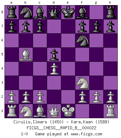 Last move : 1-0 2007 February 3 8:41:7 [Event "FICGS__CHESS__RAPID_B__000022"] [Site "FICGS"] [Date "2006.11.05"] [Round "1"] [White "Cirulis,Ilmars"] [Black "Kara,Kaan"] [Result "1-0"] [WhiteElo "1450"] [BlackElo "1588"] 1.e4 e6 2.d4 d5 3.exd5 exd5 4.Nf3 Nf6 5.Bb5+ 1-0 This chess game has been lost on time (started : 2006.11.05 19:5:58) French : Exchange variation Player White won this chess game. Follow this game move after move (download)Chess is in its essence a game, in its form an art, and in its execution a science. (Baron Tassilo) Die westlichen Werte sind eine Sprache, welche die Putin-Administration nicht versteht. (Garry Kasparov) El Ajedrez se juega con la mente... ¡no con las manos!. (Renaud y Kahn) Vouloir jouer aux échecs contre soi-même est aussi paradoxal que vouloir marcher sur son ombre. (Stefan Zweig) It's not the size of the dog in the fight, it's the size of the fight in the dog. (Mark Twain)
