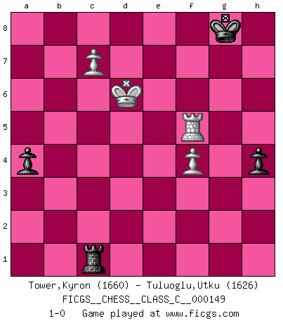 Last move : 1-0 2010 September 17 11:18:27 [Event "FICGS__CHESS__CLASS_C__000149"] [Site "FICGS"] [Date "2010.06.28"] [Round "1"] [White "Tower,Kyron"] [Black "Tuluoglu,Utku"] [Result "1-0"] [WhiteElo "1660"] [BlackElo "1626"] 1.e4 c6 2.d4 d5 3.Nc3 dxe4 4.Nxe4 Nd7 5.Nf3 Ngf6 6.Bd3 Nxe4 7.Bxe4 Nf6 8.Bd3 Bg4 9.c3 e6 10.Bg5 Be7 11.O-O O-O 12.h3 Bh5 13.a4 Qd5 14.Bh4 Bd8 15.Be2 Bc7 16.c4 Qa5 17.Ra3 Ne4 18.Be7 Bd6 19.Bxd6 Nxd6 20.Ne5 Bxe2 21.Qxe2 Nf5 22.Qg4 Qb6 23.Nd7 Qxb2 24.R3a1 Rfd8 25.Rab1 Qxd4 26.Qxd4 Nxd4 27.Rxb7 f6 28.f4 a5 29.Kf2 Nf5 30.Rd1 h5 31.g3 Ne7 32.Nxf6+ gxf6 33.Rxd8+ Rxd8 34.Rxe7 Rd2+ 35.Ke3 Ra2 36.Rxe6 Rxa4 37.Rxc6 Ra3+ 38.Kd4 Rxg3 39.Rxf6 Rxh3 40.c5 Rh1 41.Rf5 a4 42.c6 Rd1+ 43.Ke5 Rc1 44.Kd6 h4 45.c7 1-0 Caro-Kann : Steinitz variation Kingside Castling by player White (move 11) Kingside Castling by player Black (move 11) 10 pieces endgame at move 38 : White KRPPP , Black KRPPP WHITE : King + 1 Rook 3 Pawns BLACK : King + 1 Rook 3 Pawns 9 pieces endgame at move 39 : White KRPPP , Black KRPP WHITE : King + 1 Rook 3 Pawns BLACK : King + 1 Rook 2 Pawns 8 pieces endgame at move 39 : White KRPP , Black KRPP WHITE : King + 1 Rook 2 Pawns BLACK : King + 1 Rook 2 Pawns Player White won this chess game. Follow this game move after move (download)Chess is ruthless: you've got to be prepared to kill people. (Nigel Short) Sitze auf Deine Hände. (Siegbert Tarrasch) No hay precio que no valga la pena por la cabellera del Rey enemigo. (Koblentz) Aux échecs, l'amour-propre est satisfait quand on remporte la victoire, mais il n'y a pas de honte à être battu. (Benjamin Franklin) Wisdom doesn't necessarily come with age. Sometimes age just shows up all by itself. (Tom Wilson)