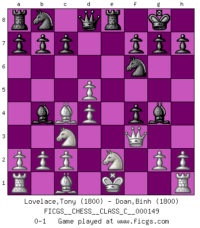 Last move : 0-1 2010 August 10 22:29:39 [Event "FICGS__CHESS__CLASS_C__000149"] [Site "FICGS"] [Date "2010.06.28"] [Round "1"] [White "Lovelace,Tony"] [Black "Doan,Binh"] [Result "0-1"] [WhiteElo "1800"] [BlackElo "1800"] 1.f4 e5 2.e4 exf4 3.Bc4 d5 4.exd5 Nf6 5.Nc3 Bb4 6.Qf3 O-O 7.d4 Re8+ 8.Nge2 Bg4 0-1 This chess game has been lost on time (started : 2010.06.28 9:35:33) Bird : From gambit Kingside Castling by player Black (move 6) Player Black won this chess game. Follow this game move after move (download)War is the child of passion, passion is the child of narcissism and narcissism is the child. (...) Another game ? (Thibault de Vassal) Ich erzeugte keinen Neid, da mich die Schachspieler als Musiker und die Musiker als Schachspieler betrachteten. (Mark Taimanov) Todavía soy una víctima del Ajedrez. Tiene toda la belleza del arte y mucho mas. No puede ser comercializado. El Ajedrez es mas puro que el arte en su posición social. (Marcel Duchamp) J'apprécie les joueurs d'est-indienne, c'est grâce à eux que je nourris ma famille depuis tant d'années. (Petrosian) He who defends everything defends nothing. (Frederick the Great)