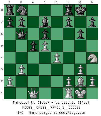 Last move : 1-0 2007 March 29 3:13:32 [Event "FICGS__CHESS__RAPID_B__000022"] [Site "FICGS"] [Date "2006.11.05"] [Round "1"] [White "Makosiej,Wladyslaw"] [Black "Cirulis,Ilmars"] [Result "1-0"] [WhiteElo "1600"] [BlackElo "1450"] 1.d4 d6 2.Nf3 Nf6 3.c4 g6 4.g3 Bg7 5.Bg2 O-O 6.O-O c5 7.d5 Bf5 8.Nc3 Qb6 9.b3 Ne4 10.Bb2 Nxc3 11.Bxc3 Bxc3 12.Nh4 Bxa1 13.Qxa1 Bd7 14.Qc1 e6 15.e4 exd5 16.cxd5 1-0 This chess game has been lost on time (started : 2006.11.05 19:5:58) Queen's Pawn Kingside Castling by player Black (move 5) Kingside Castling by player White (move 6) Player White won this chess game. Follow this game move after move (download)If your opponent offers you a draw, try to work out why he thinks he's worse off. (Nigel Short) Das Zentrum ist der Balkan des Schachbretts - Kriegshandlungen können in jedem Moment ausbrechen. (Aaron Nimzowitsch) Si el Ajedrez es una ciencia, es la mas inexacta. Si el Ajedrez es un arte, es demasiado inexacto para ser visto como tal. Si el Ajedrez es un deporte, es demasiado esotérico. Si el Ajedrez es un juego, es demasiado exigente para ser solo un juego. Si el Ajedrez es una aventura, es una muy demandante. Si el Ajedrez es una pasión, es una muy gratificante. Si el Ajedrez es la vida, es una muy triste. (Anónimo) On entre au jeu d'Echecs comme on entre en Religion. Pour le joueur d'Echecs, la partie d'Echecs c'est l'office, la messe, le défilé du 1er Mai, le dépôt de gerbe au Monument aux Morts. C'est un drame sacré. (Michel Roos) If computers get too powerful, we can organize them into committees. That'll do them in. (Anonymous)