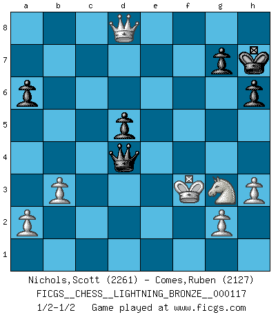 Last move : 1/2-1/2 2010 June 29 23:55:42 [Event "FICGS__CHESS__LIGHTNING_BRONZE__000117"] [Site "FICGS"] [Date "2010.06.29"] [Round "1"] [White "Nichols,Scott"] [Black "Comes,Ruben"] [Result "1/2-1/2"] [WhiteElo "2261"] [BlackElo "2127"] 1.e4 c5 2.Nf3 d6 3.d4 cxd4 4.Nxd4 Nf6 5.Nc3 a6 6.Be3 e5 7.Nf3 Be7 8.Bc4 O-O 9.O-O Be6 10.Qe2 Qc7 11.Bb3 Qc6 12.Ng5 Bxb3 13.cxb3 b5 14.Qd3 h6 15.Nf3 b4 16.Nd5 Nxd5 17.Rfc1 Nc3 18.bxc3 f5 19.Nd2 fxe4 20.Nxe4 d5 21.Ng3 bxc3 22.Rxc3 Qe6 23.Rac1 Ba3 24.Bc5 Bxc1 25.Bxf8 Bb2 26.Rc7 Nd7 27.Qc2 Nxf8 28.Qxb2 Rd8 29.Qc1 e4 30.h3 Qe5 31.Rc5 Ne6 32.Rc8 Kh7 33.Rxd8 Nxd8 34.Qc8 e3 35.Qxd8 exf2+ 36.Kxf2 Qd4+ 37.Kf3 1/2-1/2 Sicilian : Najdorf, Byrne (English) attack Kingside Castling by player Black (move 8) Kingside Castling by player White (move 9) This chess game ended in a draw. Follow this game move after move (download)There are two types of sacrifices: correct ones and mine. (Mikhail Tal) Im Schach nämlich geht es darum, daß Ich des Gegners klein zu kriegen, sein Ego zu zerbrechen und zu zermahlen, seine Selbstachtung zu zertreten und zu verscharren und seine ganze mißachtenswerte sogenannte Persönlichkeit ein für alle Mal tot zu hacken und zu zerstampfen und dadurch die menschliche Gesellschaft von einer stinkenden Pestbeule zu befreien. Es ist ein königliches Spiel. (Robert James Fischer) Todo lo que importa ante el tablero de Ajedrez son buenas jugadas. (Bobby Fischer) On croit qu'il y a plus de mauvais joueurs que de bons joueurs, c'est faux : Il y a autant de joueurs qui gagnent que de joueurs qui perdent. (Philippe Geluck) The weakness of an artist is dogma. (Josh Waitzkin)